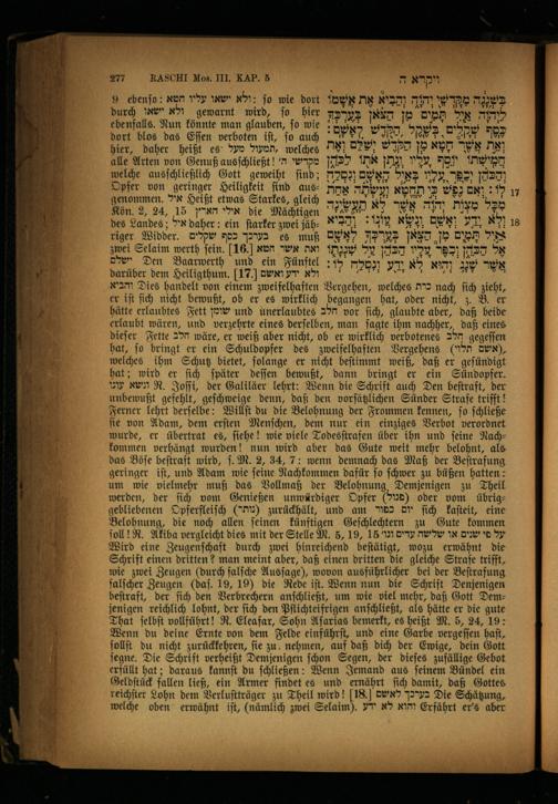 darüber dem Heiligthum.]17.[ ולא ידע ואשם והביא Dies handelt von einem zweifelhaften Vergehen, welches כרת nach ſich zieht, er iſt ſich nicht bewußt, ob er es wirklich begangen hat, oder nicht, z. B. er hätte erlaubtes Fett שומן und unerlaubtes הלב vor ſich, glaubte aber, daß beide erlaubt wären, und verzehrte eines derſelben, man ſagte ihm nachher, daß eines dieſer Fette הלב wäre, er weiß aber nicht, ob er wirklich verbotenes הלב gegeſſen hat, jo bringt er ein Schuldopfer des zweifelhaften Vergehens ,(אשם תלוי) welches ihm Schutz bietet, ſolange er nicht beſtimmt weiß, daß er geſündigt hat; wird er ſich ſpäter deſſen bewußt, dann bringt er ein Sündopfer. w den R. Joſſi, der Galiläer lehrt: Wenn die Schrift auch Den beſtraft, der unbewußt gefehlt, geſchweige denn, daß den vorſätzlichen Sünder Strafe trifft! Ferner lehrt derſelbe: Willſt du die Belohnung der Frommen kennen, ſo ſchließe ſie von Adam, dem erſten Menſchen, dem nur ein einziges Verbot verordnet wurde, er übertrat es, ſiehe! wie viele Todesſtrafen über ihn und ſeine Nachkommen verhängt wurden! nun wird aber das Gute weit mehr belohnt, als das Böſe beſtraft wird, ſ. M. 2, 34,7: wenn demnach das Maß der Beſtrafung geringer iſt, und Adam wie ſeine Nachkommen dafür ſo ſchwer zu büßen hatten: um wie vielmehr muß das Vollmaß der Belohnung, Demjenigen zu Theil werden, der ſich vom Genießen unwürdiger Opfer(פגול) oder vom übriggebliebenen Opferfleiſch(Umar) zurückhält, und am כפור DV ſich kaſteit, eine Belohnung, die noch allen ſeinen künftigen Geſchlechtern zu Gute kommen ſoll! R. Akiba vergleicht dies mit der Stelle M. 5, 19, 15 על פי שנים או שלשה עדים ונו' Wird eine Zeugenſchaft durch zwei hinreichend beſtätigt, wozu erwähnt die Schrift einen dritten? man meint aber, daß einen dritten die gleiche Strafe trifft, wie zwei Zeugen(durch falſche Ausſage), wovon ausführlicher bei der Beſtrafung falſcher Zeugen(daſ. 19, 19) die Rede iſt. Wenn nun die Schrift Denjenigen beſtraft, der ſich den Verbrechern anſchließt, um wie viel mehr, daß Gott Demjenigen reichlich lohnt, der ſich den Pflichteifrigen anſchließt, als hätte er die gute That ſelbſt vollführt! R. Eleafar, Sohn Aſarias bemerkt, es heißt M. 5, 24, 19: Wenn du deine Ernte von dem Felde einführſt, und eine Garbe vergeſſen haſt, ſollſt du nicht zurückkehren, ſie zu nehmen, auf daß dich der Ewige, dein Gott ſegne. Die Schrift verheißt Demjenigen ſchon Segen, der dieſes zufällige Gebot erfüllt hat; daraus kannſt du ſchließen: Wenn Jemand aus ſeinem Bündel ein Geldſtück fallen ließ, ein Armer findet es und ernährt ſich damit, daß Gottes reichſter Lohn dem Verluſtträger zu Theil wird! 18. בערכך לאשם Die Schätzung, welche oben erwähnt iſt,(nämlich zwei Selaim). והוא לא ידע Erfährt er's aber