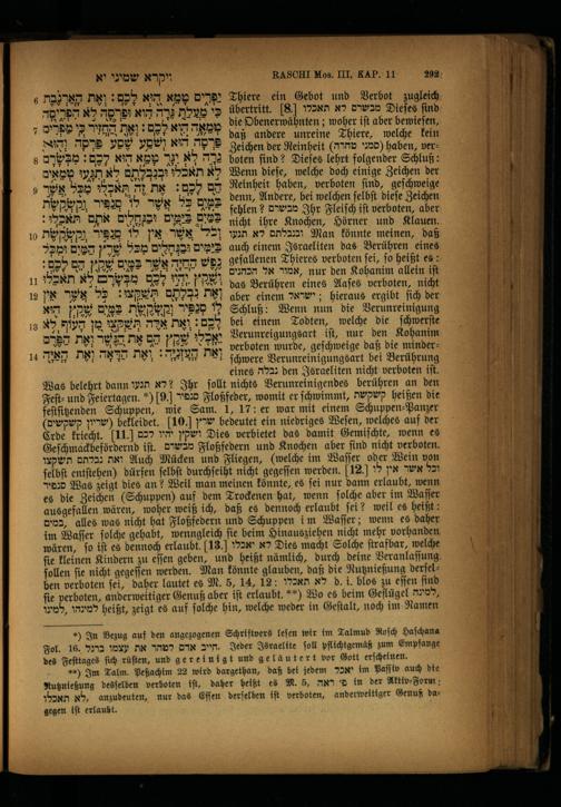 Was belehrt dann?לא תנעו Ihr ſollt nichts Verunreinigendes berühren an den Feſt⸗ und Feiertagen.)]9.[ מנפיר Floßfeder, womit er ſchwimmt, קשקשת heißen die feſtſitzendden Schuppen, wie Sam. 1, 17: er war mit einem Schuppen⸗Panzer (שריון קשקשים) bekleidet. 10] שרץ bedeutet ein niedriges Weſen, welches auf der Erde kriecht. 11 ושקץ יהיו לכם Dies verbietet das damit Gemiſchte, wenn es Geſchmackbefördernd iſt. מבשרם Floßfedern und Knochen aber ſind nicht verboten. ואת נבלתם תשקצו Auch Mücken und Fliegen,(welche im Waſſer oder Wein von ſelbſt entſtehen) dürfen ſelbſt durchſeiht nicht gegeſſen werden. 12] וכל אשר אין לו סנפיר Was zeigt dies an? Weil man meinen könnte, es ſei nur dann erlaubt, wenn es die Zeichen(Schuppen) auf dem Trockenen hat, wenn ſolche aber im Waſſer ausgefallen wären, woher weiß ich, daß es dennoch erlaubt ſei? weil es heißt: ,במים alles was nicht hat Floßfedern und Schuppen i m Waſſer; wenn es daher im Waſſer ſolche gehabt, wenngleich ſie beim Hinausziehen nicht mehr vorhanden wären, fo iſt es dennoch erlaubt. 13. לא יאכלו Dies macht Solche ſtrafbar, welche ſie kleinen Kindern zu eſſen geben, und heißt nämlich, durch deine Veranlaſſung ſollen fie nicht gegeſſen werden. Man könnte glauben, daß die Nutznießung derſelben verboten ſei, daher lautet es M. 5, 14, 12: לא תאכלו d. i. blos zu eſſen ſind fie verboten, anderweitiger Genuß aber iſt erlaubt.“) Wo es beim Geflügel ,למינה למינהו ,למינו heißt, zeigt es auf ſolche hin, welche weder in Geſtalt, noch im Namen