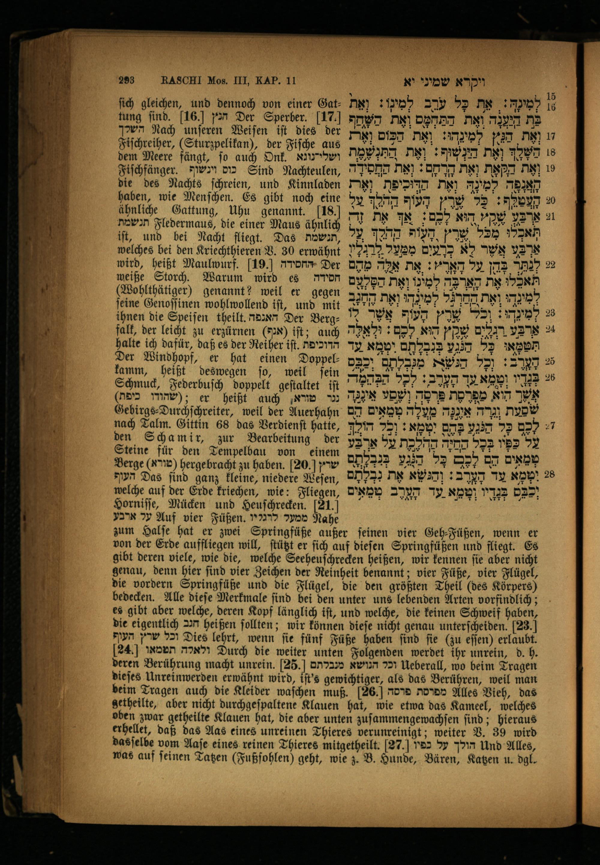 ſich gleichen, und dennoch von einer Gattung find. 16) הנץ Der Sperber. 17. השלך Nach unſeren Weiſen iſt dies der Fiſchreiher,(Sturzpelikan), der Fiſche aus dem Meere fängt, fo auch Onk. ושלידנונא Fiſchfänger. Menn כוס Sind Nachteulen, die des Nachts ſchreien, und Kinnladen haben, wie Menſchen. Es gibt noch eine ähnliche Gattung, Uhu genannt.[18 תנשמת Fledermaus, die einer Maus ähnlich iſt, und bei Nacht fliegt. Das ,תנשמת welches bei den Kriechthieren V. 30 erwähnt wird, heißt Maulwurf. 19. החסידה Der weiße Storch. Warum wird es חסידה (Wohlthätiger) genannt? weil er gegen ſeine Genoſſinen wohlwollend iſt, und mit ihnen die Speiſen theilt. האגפה Der Berg: falt, der leicht zu erzürnen(Px) iſt; auch halte ich dafür, daß es der Reiher iſt. הדוכיפת Der Windhopf, er hat einen Doppelkamm, heißt deswegen ſo, weil fein Schmuck, Federbuſch doppelt geſtaltet iſt ;(שהודו כיפת) er heißt auch מזרא, w