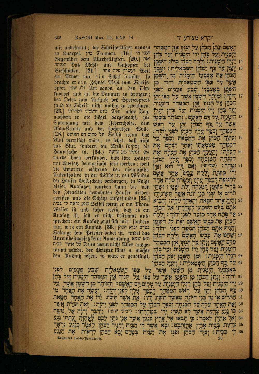 mir unbekannt; die Schrifterklärer nennen es Knorpel. בהן Daumen. 16 לפני ה' Gegenüber dem Allerheiligſten. 20.) ואת המנהה Das Mehl- und Gußopfer bei Viehſtücken. 21. דחא ועשרון סלת 1 ein Armer nur ein Schaf brachte, fo brachte er ein Zehntel Mehl zum Speiſeopfer. ולג שכן Um davon an den Ohr: knorpel und an die Daumen zu bringen; des Oeles zum Aufguß des Speiſeopfers fand die Schrift nicht nöthig zu erwähnen. 23) ביום השמיני לטהרתו Der achte Tag, nachdem er die Vögel dargebracht, zur Sprengung mit dem Zedernholze, dem Yſop⸗Kraute und der hochrothen Wolle. [28.] על מקום דם האשם Selbſt wenn das Blut verwiſcht wäre; es lehrt, daß nicht das Blut, ſondern die Stelle(מקום) 6 Hauptfache iſt. 34) ונתתי נגע צרעת 8 wurde ihnen verkündet, daß ihre Häuſer mit Ausſatz heimgeſuchl ſein werden; weil die Emoriter während des vierzigjahr. Aufenthaltes in der Wüſte in den Wänden der Häuſer Goldſchätze verbargen, in Folge dieſes Ausſatzes wurden dann die von den Israeliten bewohnten Häuſer nieder: geriſſen und die Schätze aufgefunden 35. כנגע נראה לי בבית Selbſt wenn er ein ThoraWeiſer iſt und ſicher weiß, daß es ein Ausſatz iſt, ſoll er nicht beſtimmt aus— ſprechen: ein Ausſatz zeigt ſich mir! ſondern nur, wie ein Ausſatz. 36. בטרם יבוא הכהן Solange kein Prieſter dabei 3 findet das| Unreinheitsgeſetz keine Anwendung, ולא יטמא כל אשר בבית Denn wenn nicht Alles ausge