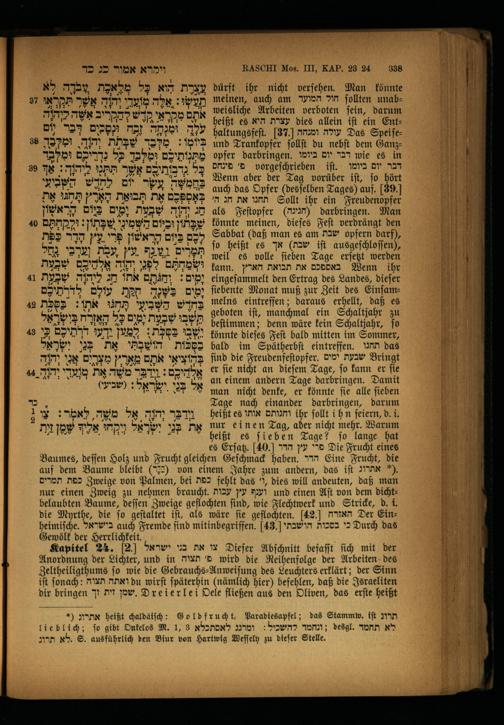 dürft ihr nicht verſehen. Man könnte meinen, auch am חול המועד ſollten unabweisliche Arbeiten verboten ſein, darum heißt es עצרת היא dies allein iſt ein Enthaltungsfeſt. 37 עולה ומנחה Das Speiſeund Trankopfer ſollſt du nebſt dem Ganzopfer darbringen. YA דבר יום wie es in פינחס S vorgeſchrieben iſt. wma dy דבר Wenn aber der Tag vorüber iſt, ſo hört auch das Opfer(desſelben Tages) auf. 39. תחגו את חג ה' Sollt ihr ein Freudenopfer als Feſtopfer(man) darbringen. Man könnte meinen, dieſes Feſt verdrängt den Sabbat(daß man es am שבת opfern darf), ſo heißt es שבת) אך iſt ausgeſchloſſen), weil es volle ſieben Tage erſetzt werden kann. באספכם את תבואת הארץ Wenn ihr eingeſammelt den Ertrag des Landes, dieſer ſiebente Monat muß zur Zeit des Einſammelns eintreffen; daraus erhellt, daß es geboten iſt, manchmal ein Schaltjahr zu beſtimmen; denn wäre kein Schaltjahr, ſo könnte dieſes Feſt bald mitten im Sommer, bald im Spätherbſt eintreffen. ann das find die Freudenfeſtopfer. DW“ שבעת Bringt er ſie nicht an dieſem Tage, ſo kann er ſie an einem andern Tage darbringen. Damit man nicht denke, er könnte ſie alle ſieben Tage nach einander darbringen, darum heißt 68 וחגותם אותו ihr ſollt ihn feiern, d. i. nur einen Tag, aber nicht mehr. Warum heißt es ſieben Tage ſo lange hat es Erſatz. 40. פרי עץ הדר Die Frucht eines