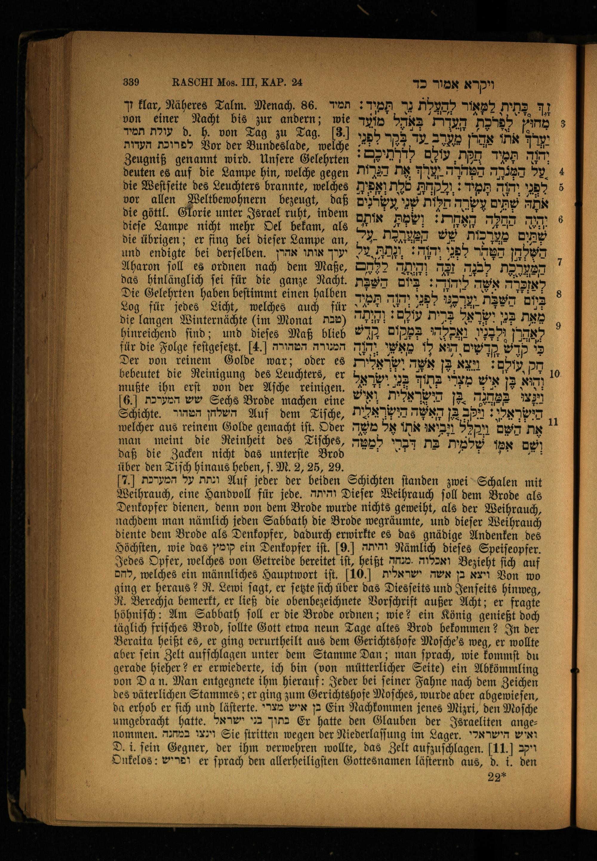 ]7.[ ונתת על המערכת Auf jeder der beiden Schichten ſtanden zwei Schalen mit Weihrauch, eine Handvoll für[600. והיתה Dieſer Weihrauch ſoll dem Brode als Denkopfer dienen, denn von dem Brode wurde nichts geweiht, als der Weihrauch, nachdem man nämlich jeden Sabbath die Brode wegräumte, und dieſer Weihrauch diente dem Brode als Denkopfer, dadurch erwirkte es das gnädige Andenken des Höchſten, wie das קומץ ein Denkopfer iſt. 9. והיתה Nämlich dieſes Speiſeopfer. Jedes Opfer, welches von Getreide bereitet iſt, heißt ואכלוה.מנחה Bezieht ſich auf להם, welches ein männliches Hauptwort iſt. 10. möx ויצא בן אשה Von wo ging er heraus? R. Lewi ſagt, er ſetzte{ich über das Diesſeits und Jenſeits hinweg, R. Berechja bemerkt, er ließ die obenbezeichnete Vorſchrift außer Acht; er fragte höhniſch: Am Sabbath ſoll er die Brode ordnen; wie? ein König genießt doch täglich friſches Brod, ſollte Gott etwa neun Tage altes Brod bekommen? In der Beraita heißt es, er ging verurtheilt aus dem Gerichtshofe Moſche's weg, er wollte aber ſein Zelt aufſchlagen unter dem Stamme Dan; man ſprach, wie kommſt du gerade hieher? er erwiederte, ich bin won mütterlicher Seite) ein Abkömmling von Dan. Man entgegnete ihm hierauf: Jeder bei ſeiner Fahne nach dem Zeichen des väterlichen Stammes; er ging zum Gerichtshofe Moſches, wurde aber abgewieſen, da erhob er ſich und läſterte. D בן איש Ein Nachkommen jenes Mizri, den Moſche umgebracht hatte. בתוך בני ישראל Er hatte den Glauben der Israeliten ange