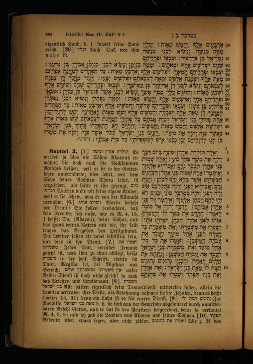 Moſches heißen, weil er fie in der%lehre unterrichtete; dies lehrt, wer dem Sohn ſeines Nächſten Thora lehrt, iſt anzuſehen, als hätte er ihn g gezeugt. ביום m דבר Wurden dieſe wie feine eigene Kinder, weil er ſie lehrte, was er. der Allmacht vernahm. 6. ושרתו אותו Worin beſteht\ der Dienſt? Sie ſollen. daß kein Zremder ſich nahe, wie es M. 4, 18, 1 heißt: Du,(Aharon), deine Söhne, und das Haus deines Vaters mit dir, ihr ſollt tragen das Vergehen des Heiligthums. Die Lewiten ſollen dir dabei behilflich ſein, und dies iſt ihr Dienſt. 7 ושמרו את משמרתו Jedes Amt, worüber Jemand geſetzt iſt, was ihm zu thun obliegt, heißt משמרת in der heil. Schrift, ebenſo im Talm. Megilla 13, bei ö und Sereſch: DW משמרתי ומשמרתך fx unſer Beider Dienſt iſt doch nicht ה ſo auch das Prieſter⸗ und Lewitenamt. 8] משמרת