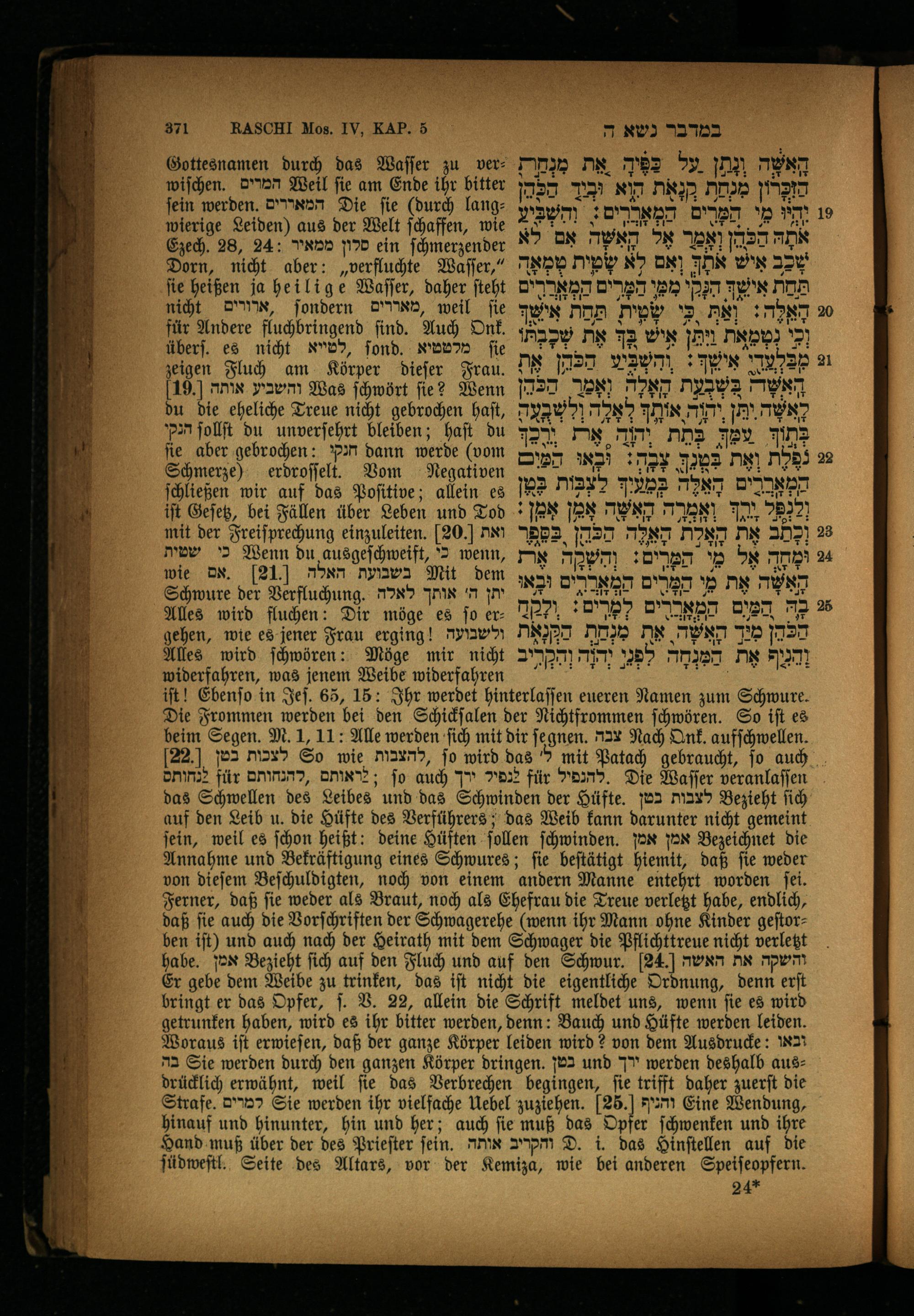 iſt! Ebenſo in Jeſ. 65, 15: Ihr werdet hinterlaſſen eueren Namen zum Schwure. Die Frommen werden bei den Schickſalen der Nichtfrommen ſchwören. So iſt es beim Segen. M. 1, 11: Alle werden ſich mit dir ſegnen. צבה Nach Qnk. aufſchwellen. [22.] לצכות במן So wie ,להצבות fo wird das mit Patach gebraucht, ſo auch לנחותס für לראותם ,להנחותם; ſo auch כנפי? ירך für.להנפיל Die Waſſer veranlaſſen das Schwellen des Leibes und das Schwinden der Hüfte. לצבות במן Bezieht ſich auf den Leib u. die Hüfte des Verführers das Weib kann darunter nicht gemeint ſein, weil es ſchon heißt: deine Hüften ſollen ſchwinden. אמן אמן Bezeichnet die Annahme und Bekräftigung eines Schwures; ſie beſtätigt hienſt, daß ſie weder von dieſem Beſchuldigten, noch von einem andern Manne entehrt worden ſei. Ferner, daß ſie weder als Braut, noch als Ehefrau die Treue verletzt habe, endlich, daß ſie auch die Vorſchriften der Schwagerehe(wenn ihr Mann ohne Kinder geſtorben iſt) und auch nach der Heirath mit dem Schwager die Pflichttreue nicht verletzt habe. אמן Bezieht ſich auf den Fluch und auf den Schwur. 24. והשקה את האשה Er gebe dem Weibe zu trinken, das iſt nicht die eigentliche Ordnung, denn erſt bringt er das Opfer, ſ. V. 22, allein die Schrift meldet uns, wenn ſie es wird getrunken haben, wird es ihr bitter werden, denn: Bauch und Hüfte werden leiden. Woraus iſt erwieſen, daß der ganze Körper leiden wird? von dem Ausdrucke: wan בה Sie werden durch den ganzen Körper dringen. בטן und ירך werden deshalb ausdrücklich erwähnt, weil ſie das Verbrechen beglngen, ſie trifft daher zuerſt die Strafe. למרים Sie werden ihr vielfache Uebel zuziehen. 1. AM Eine Wendung, hinauf und hinunter, hin und her; auch ſie muß das Opfer ſchwenken und ihre Hand muß über der des Prieſter fein, והקריב אותה D. i. das Hinſtellen auf 6 ſüdweſtl. Seite des Altars, vor der Kemiza, wie bei anderen Speiſeopfern.