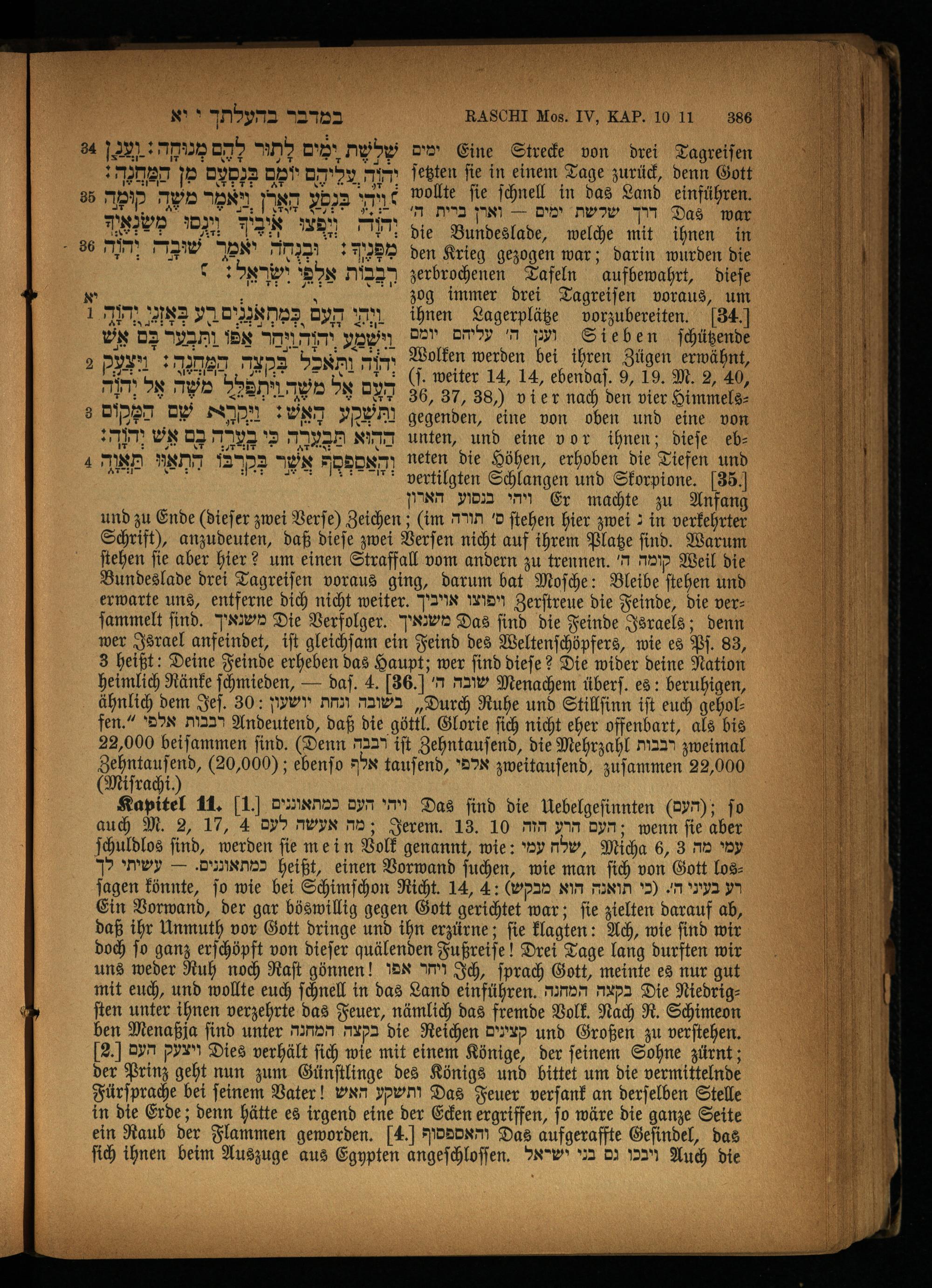 Eine Strecke von drei Tagreiſen ימים ſetzten fie in einem Tage zurück, denn Gott wollte ſie ſchnell in das Land einführen. , וארן ברית ה' die Bundeslade, welche mit ihnen in den Krieg gezogen war; darin wurden die zerbrochenen Tafeln aufbewahrt, dieſe zog immer drei Tagreiſen voraus, um ihnen Lagerplätze vorzubereiten. 34. Sieben ſchützende וען ה' עליהם יומם Wolfen werden bei ihren Zügen erwähnt, (ſ. weiter 14, 14, ebendaſ. 9, 19. M. 2, 40, vier nach den vier Himmels. ,38 ,37 ,36 gegenden, eine von oben und eine von unten, und eine vor ihnen; dieſe eb⸗ neten die Höhen, erhoben die Tiefen und vertilgten Schlangen und Skorpione. 35