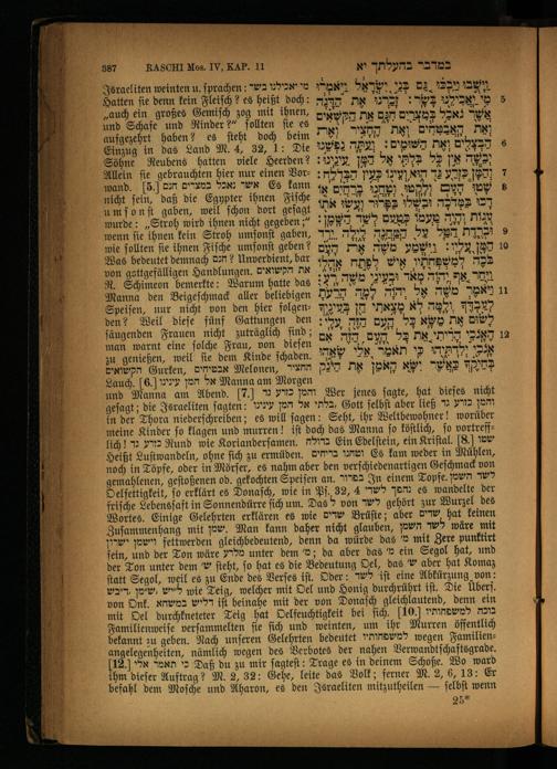 Israeliten weinten u. ſprachen:** מי ואכילנו Hatten fie denn kein Fleiſch? es heißt doch: „auch ein großes Gemiſch zog mit ihnen, und Schafe und Rinder?“ ſollten ſie es aufgezehrt haben? es ſteht doch beim Einzug in das Land M. 4, 32, 1: Die Söhne Reubens hatten viele Heerden? Allein fie gebrauchten hier nur einen Vorwand.]5.[ אשר נאכל במצרים הגם Es kann nicht ſein, daß die Egypter ihnen Fiſche um ſonſt gaben, weil ſchon dort gejagt wurde:„Stroh wird ihnen nicht gegeben;“ wenn ſie ihnen kein Stroh umſonſt gaben, wie ſollten ſie ihnen Fiſche umſonſt geben? Was bedeutet demnach הנם Unverdient, bar von gottgefälligen Handlungen. את הקשואים R. Schimeon bemerkte: Warum hatte das Manna den Beigeſchmack aller beliebigen Speiſen, nur nicht von den hier folgenden? Weil dieſe fünf Gattungen den