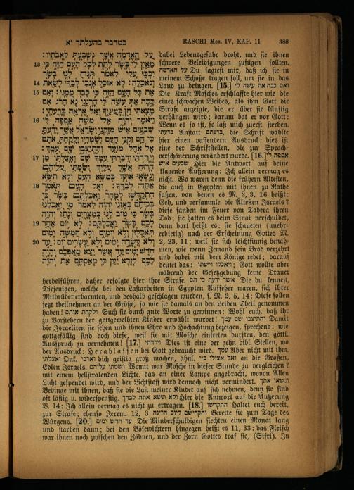 2, 23, 11; weil ſie ſich leichtſinnig benahmen, wie wenn Jemand ſein Brod verzehrt und dabei mit dem Könige redet; darauf deutet das: ויאכלו וישתו; Gott wollte aber während der Geſetzgebung keine Trauer herbeiführen, daher erfolgte hier ihre Strafe. DM אשר ידעת כי Die du kenneſt, Diejenigen, welche bei den Laſtarbeiten in Egypten Aufſeher waren, ſich ihrer Mitbrüder erbarmten, und deshalb geſchlagen wurden, ſ. M. 2, 5, 14: Dieſe ſollen jetzt theilnehmen an der Größe, ſo wie ſie damals an den Leiden Theil genommen haben! ולקחת אותם Such fie durch gute Worte zu gewinnen: Wohl euch, daß ihr zu Vorſtehern der gottgeweihten Kinder erwählt wurdet! והתיצבו שם עמך Damit die Israeliten ſie ſehen und ihnen Ehre und Hochachtung bezeigen, ſprechend: wie gottgefällig ſind doch dieſe, weil ſie mit Moſche eintreten durften, den göttl. ÄAusſpruch zu vernehmen! 17 וירדתי Dies iſt eine der zehn bibl. Stellen, wo der Ausdruck: Herablaſfen bei Gott gebraucht wird. עמך Aber nicht mit ihm. ואצלתי Onk. וארבי dich geiſtig groß machen, ähnl. ואל אצילי ב"י an die Großen, Edlen Israels. ושמתי עליהם Womit war Moſche in dieſer Stunde zu vergleichen? mit einem hellſtralenden Lichte, das an einer Lampe angebracht, wovon Allen Licht geſpendet wird, und der Lichtſtoff wird dennoch nicht vermindert. תשאו אתך Bedinge mit ihnen, daß ſie die Laſt meiner Kinder auf ſich nehmen, denn ſie ſind oft läſtig u. widerſpenſtig. ורא תשא אתה לבדך Hier die Antwort auf die Außerung V. 14: Ich allein vermag es nicht zu ertragen. 18. התקדשו Haltet euch bereit, zur Strafe; ebenſo Jerem. 12, 3 והקדישם ליום הריגה Bereite fie zum Tage des Würgens. 20. עד חדש ימים Die Minderſchuldigen ſiechten einen Monat lang und ſtarben dann; bei den Böſewichtern hingegen heißt es 11, 33: das Fleiſch war ihnen noch zwiſchen den Zähnen, und der Zorn Gottes traf ſie, Sifri). In