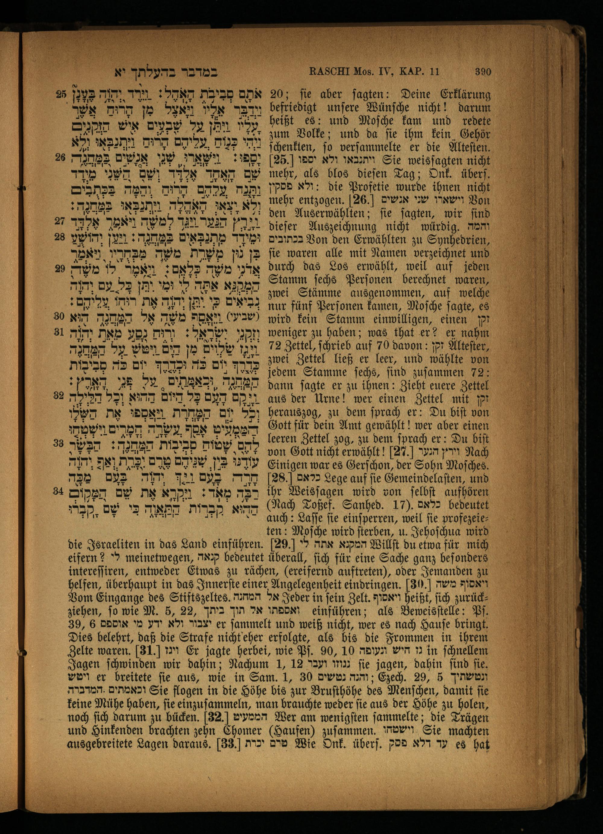20; ſie aber ſagten: Deine Erklärung befriedigt unſere Wünſche nicht! darum heißt es: und Moſche kam und redete zum Volke; und da ſie ihm kein Gehör ſchenklen, fo verſammelte er die Alteſten. ]95.[ ויתנבאו ולא יספו Sie weisſagten nicht mehr, als blos dieſen Tag; Onk. überſ. ולא פסקין: die Profetie wurde ihnen nicht mehr entzogen. 26. וישארו שני אנשים Von den Auserwählten; ſie ſagten, wir ſind dieſer Auszeichnung nicht würdig. wm בכתובים Von den Erwählten zu Synhedrien, ſie waren alle mit Namen verzeichnet und durch das Los erwählt, weil auf jeden Stamm ſechs Perſonen berechnet waren, zwei Stämme ausgenommen, auf welche nur fünf Perſonen kamen, Moſche ſagte, es wird kein Stamm einwilligen, einen FP weniger zu haben; was that er? er nahm 79 Zettel, ſchrieb auf 70 davon: זקן Alteſter, zwei Zettel ließ er leer, und wählte von jedem Stamme ſechs, ſind zuſammen 72: dann ſagte er zu ihnen: Zieht euere Zettel aus der Urne! wer einen Zettel mit זקן herauszog, zu dem ſprach er: Du biſt von Gott für dein Amt gewählt! wer aber einen leeren Zettel zog, zu dem ſprach er: Du biſt von Gott nicht erwählt! 27. וירץ הנער Nach Einigen war es Gerſchon, der Sohn Moſches. 28. כלאם Lege auf fie Gemeindelaſten, und ihr Weisſagen wird von ſelbſt aufhören (Nach Toßef. Sanhed. 17). כלאם auch: Laſſe fie einſperren, weil fie profezeieten: Moſche wird ſterben, u. Jehoſchua wird