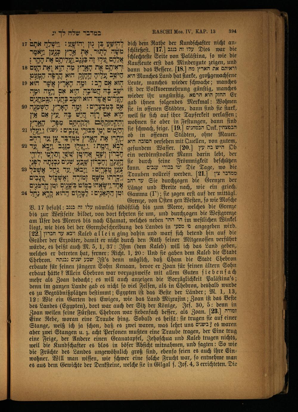 . Grenze, von Oſten gen Weſten, ſo wie Moſche V. 17 hefahl: עלר זה בנגב nämlich ſüdöſtlich bis zum Meere, welches die Grenze bis zur Weſtſeite bildet, von dort kehrten ſie um, und durchzogen die Weſtgrenze am Üfer des Meeres bis nach Chamat, welches neben ההר M im weſtlichen Winkel liegt, wie dies bei der Grenzbeſchreibung des Landes in מסעי 8 angegeben wird. 22 nam ויבא עד Kaleb allein ging dahin und warf ſich betend hin auf die Gräber der Erzväter, damit er nicht durch den Rath feiner Mitgenoſſen verführt würde, es heißt auch M. 5, 1, 37: Ihm(dem Kaleb) will ich das Land geben, welches er betreten hat, ferner: Richt. 1, 20: Und fie gaben dem Kaleb die Stadt Chebron. שבע שנים נבנתה Iſt's denn möglich, daß Cham die Stadt Chebron erbaute für ſeinen jüngern Sohn Kenaan, bevor er Zoan für ſeinen ältern Sohn erbaut hätte? Allein Ehebron war vorzugsweiſe mit allem Guten ſiebenfach mehr als Zoan bedacht; es will auch anzeigen die Vorzüglichkeit Paläſtina's; denn im ganzen Lande gab es nicht fo viel Felſen, als in Chebron, deshalb wurde es zu Begräbnißplätzen beſtimmt; Egypten iſt das Beſte der Länder; M. 1, 13, 12: Wie ein Garten des Ewigen, wie das Land Mizrajim; Zoan iſt das Beſte des Landes(Egypten), dort war auch der Sitz der Könige, Jeſ. 30, 5: denn in Zoan weilen feine Füͤrſten. Chebron war ſiebenfach beſſer, als Zoan. 23 זמורה Eine Rebe, woran eine Traube hing. Sobald es heißt: ſie trugen ſie auf einer Stange, weiß ich ja ſchon, daß es zwei waren, was lehrt uns בשנים 7 es waren aber zwei Stangen u. z. acht Perſonen mußten eine Traube tragen, der Eine trug eine Feige, der Andere einen Granatapfel, Jehoſchua und Kaleb trugen nichts, weil die Kundſchafter es blos in böſer Abſicht mitnahmen, und ſagten: So wie die Früchte des Landes ungewöhnlich groß find, ebenſo ſeien es auch ihre Einwohner. Will man wiſſen, wie ſchwer eine ſolche Frucht war, ſo entnehme man es aus dem Gewichte der Denkſteine, welche fie in Gilgal ſ. Joſ. 4, 3 errichteten. Die