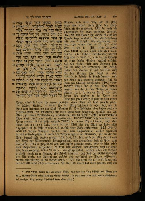 Monate und einen Tag alt iſt. 12] כמספר אשר תעשו Nach Zahl der Viehſtücke, die ihr darbringt, ſollt ihr auch die Trankopfer für jedes derſelben bereiten. 15. ככם כגר Sowie ihr, ebenſo iſt auch der Fremde dazu verhalten. Die Wiederholung mit dem כ' iſt hebr. Sprachgebrauch, wie . כמוני, כמוך, כנן ה', כארץ Kön. 1, 22, 4.-- 18) ץראה בבאכם אל Dies בבאכם iſt von allen ähnlichen Ausdrücken in der Schrift verſchieden; überall ſteht תבואו., תבוא 9; und da die Schrift bei einer dieſer Stellen deutlich erklärt, daß das Gebot nicht eher Geltung hat, als bis nach der Eroberung und Beſitznahme des Landes, ſo gilt dasſelbe auch für die übrigen. Hier heißt es aber בבאכם d. h. ſobald fie hineinkommen und das Brod des Landes genießen, ſind ſie