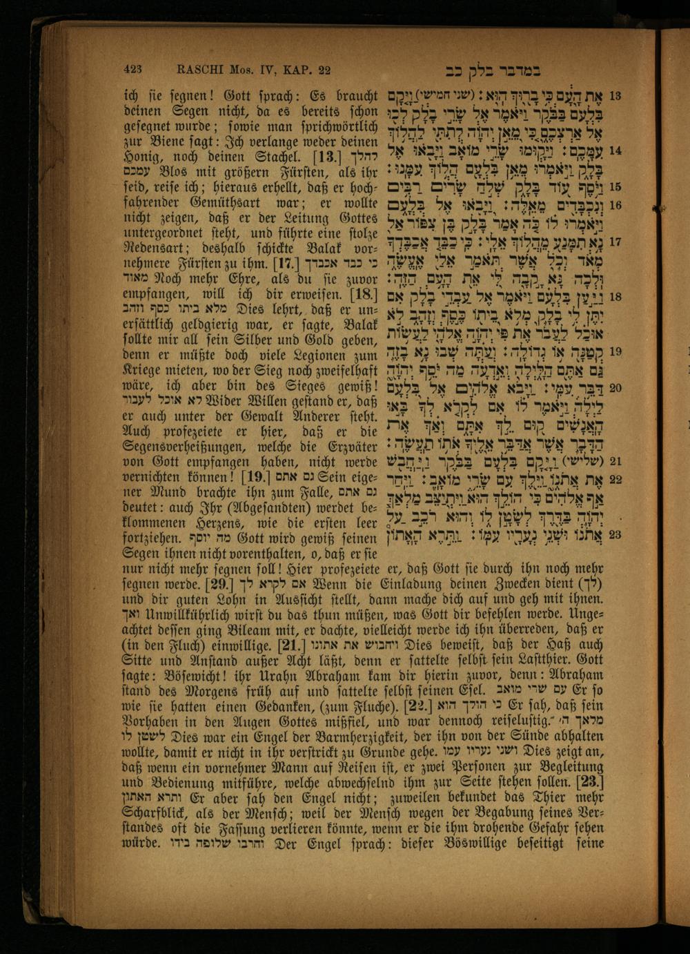 ich ſie ſegnen! Gott ſprach: Es braucht deinen Segen nicht, da es bereits ſchon geſegnet wurde; ſowie man ſprichwörtlich zur Biene ſagt: Ich verlange weder deinen Honig, noch deinen Stachel. 13. להלך עמכם Blos mit größern Fürſten, als ihr ſeid, reiſe ich; hieraus erhellt, daß er hochfahrender Gemüthsart war; er wollte nicht zeigen, daß er der Leitung Gottes untergeordnet ſteht, und führte eine ſtolze Redensart; deshalb ſchickte Balak vornehmere Fürſten zu ihm.[17.] כבד אכבדך* מאוד Noch mehr Ehre, als du fie zuvor empfangen, will ich dir erweiſen. 18 2m מלא ביתו כסף Dies lehrt, daß er unerſättlich geldgierig war, er ſagte, Balak ſollte mir all ſein Silber und Gold geben,