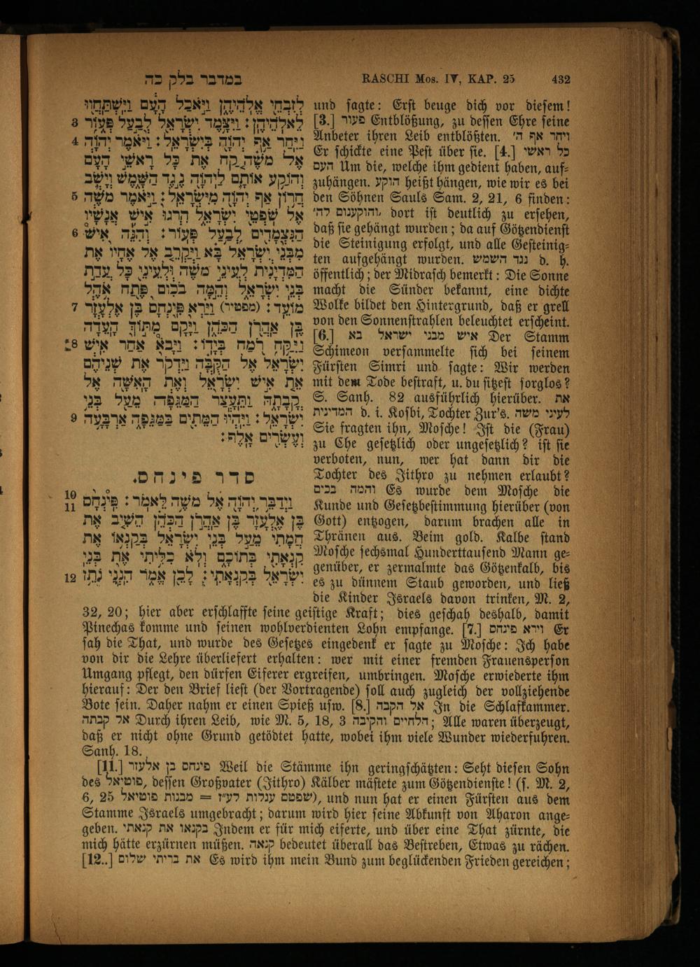 und ſagte: Erſt beuge dich vor dieſem! 3. פעור Entblößung, zu deſſen Ehre feine Anbeter ihren Leib entblößten. AN ויחר Er ſchickte eine Peſt über ſie. 4. כל ראשי dyn Um die, welche ihm gedient haben, aufzuhängen. הוקע heißt hängen, wie wir es bei den Söhnen Sauls Sam. 2, 21, 6 finden: הוקענום לה' dort iſt deutlich zu erſehen, daß ſie gehängt wurden; da auf Götzendienſt die Steinigung erfolgt, und alle Geſteinigten aufgehängt wurden. נגד השמש d. h. öffentlich; der Midraſch bemerkt: Die Sonne macht die Sünder bekannt, eine dichte Wolke bildet den Hintergrund, daß er grell von den Sonnenſtrahlen beleuchtet erſcheint. 6 Ra איש מנני ישראל Der Stamm Schimeon verſammelte ſich bei ſeinem Fürſten Simri und ſagte: Wir werden mit dem Tode beſtraft, u. du ſitzeſt ſorglos? S. Sanh. 82 ausführlich hierüber. את המדינית d. i. Koſbi, Tochter Zur's. לעיני משה Sie fragten ihn, Moſche! Iſt die(Frau) zu Che geſetzlich oder ungeſetzlich? iſt fie verboten, nun, wer hat dann dir die Tochter des Jithro zu nehmen erlaubt? והמה בכים Es wurde dem Moſche die Kunde und Geſetzbeſtimmung hierüber(von Gott) entzogen, darum brachen alle in Thränen aus. Beim gold. Kalbe ſtand Moſche ſechsmal Hunderttauſend Mann gegenüber, er zermalmte das Götzenkalb, bis es zu dünnem Staub geworden, und ließ die Kinder Israels davon trinken, M. 2,