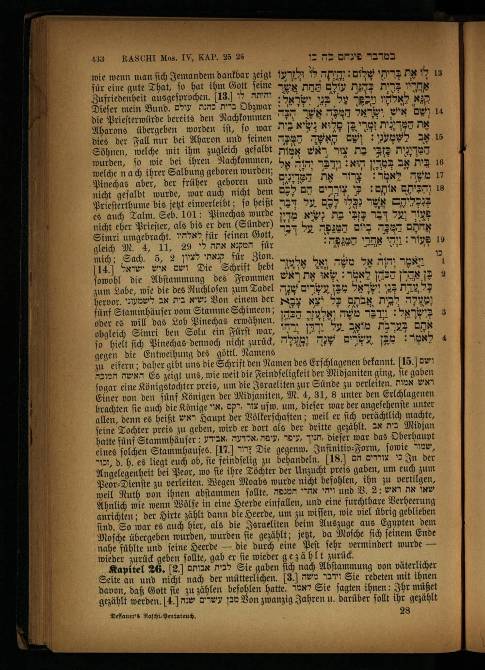 wie wenn man ſich Jemandem dankbar zeigt für eine gute That, ſo hat ihm Gott ſeine Zufriedenheit ausgeſprochen. 13. והיתה לו Dieſer mein Bund. ברית כהנת. עולם Obzwar die Prieſterwürde bereits den Nachkommen Aharons übergeben worden iſt, ſo war dies der Fall nur bei Aharon und ſeinen Söhnen, welche mit ihm zugleich geſalbt wurden, ſo wie bei ihren Nachkommen, welche n ach ihrer Salbung geboren wurden; Pinechas aber, der früher geboren und nicht geſalbt wurde, war auch nicht dem Prieſterthume bis jetzt einverleibt; ſo heißt es auch Talm. Seb. 101: Pinechas wurde nicht eher Prieſter, als bis er den(Sünder) Simri umgebracht. לאלהיו für feinen Gott, gleich M. 4, 11, 29 המקנא אתה לי für mich; Sach. 5, 2 קנאתי לצון für Zion. [14.] איש ישיאל ern Die Schrift hebt ſowohl die Abſtammung des Frommen zum Lobe, wie die des Ruchloſen zum Tadel hervor. נשיא בית אב לשמעוני Von einem der fünf Stammhäuſer vom Stamme Schimeon; oder es will das Lob Pinechas erwähnen, obgleich Simri ben Solu ein Fürſt war, ſo hielt ſich Pinechas dennoch nicht zurück, gegen die Entweihung des göttl. Namens