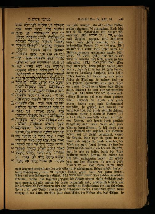 nach Ausmaß vertheilt, weil es doch beſſern und minderguten Boden enthält, ſondern durch Abſchätzung; einen כור ſchlechten Boden, gegen einen סאה guten Boden, Alles nach dem Geldwerthe geſchätzt. 55] לשמות מטות אבותם Das find die väterlichen Stämme, welche aus Egypten gezogen; die Schrift nimmt dieſes Erbſchaftsrecht ganz anders, als alle andere, die darin verhandelt ſind; gewöhnlich beerben nur die Lebenden die Verſtorbenen, hier aber beerben die Verſtorbenen die noch Lebenden. Wenn z. B. zwei Brüder aus Egypten ausgezogen waren, und Kinder hatten, beim Einzug in das Land, der Eine hatte einen Sohn, der Andere aber drei Söhne: ſo