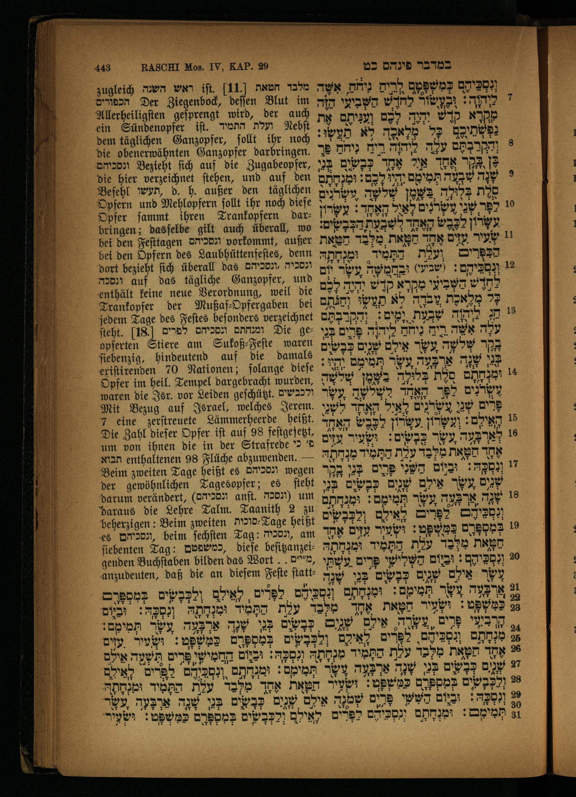 zugleich wn ראש iſt. 11. מלבד חטאת הכפורים Der Ziegenbock, deſſen Blut im Allerheiligſten geſprengt wird, der auch ein Sündenopfer 4]. ועלת התמיד Nebſt dem täglichen Ganzopfer, ſollt ihr noch die obenerwähnten Ganzopfer darbringen. נסכיהם Bezieht ſich auf die Zugabeopfer, die hier verzeichnet ſtehen, und auf den Befehl תעשו d. h. außer den täglichen Opfern und Mehlopfern ſollt ihr noch dieſe Dpfer ſammt ihren Trankopfern darbringen; dasſelbe gilt auch überall, wo bei den Feſttagen כסכיהם vorkommt, außer bei den Opfern des Laubhüttenfeſtes, denn dort bezieht ſich überall das נסכיה ונסכיהם ונסכה auf das tägliche Ganzopfer, und enthält keine neue Verordnung, weil die Trankopfer der Mußaf⸗Opfergaben bei jedem Tage des Feſtes beſonders verzeichnet ſteht. 18] ומנחתם ונסכיהם לפרים Die geopferten Stiere am Sukoß⸗Feſte waren ſiebenzig, hindeutend auf die damals exiſtirenden 70 Nationen; ſolange dieſe Opfer im heil. Tempel dargebracht wurden. waren die Isr. vor Leiden geſchützt. ורכבשים Mit Bezug auf Israel, welches Jerem. 7 eine zerſtreuete Lämmerheerde heißt. Die Zahl dieſer Opfer ft auf 98 feſtgeſetzt, um von ihnen die in der Strafrede כי* תבוא enthaltenen 98 Flüche abzuwenden. Beim zweiten Tage heißt es נסכיהם wegen der gewöhnlichen Tagesopfer; es ſteht darum verändert, נסכיהם) anſt.(נסכה um daraus die Lehre Talm. Taanith 2 zu beherzigen: Beim zweiten MW: Tage heißt es ,ונסכיהם beim ſechſten Tag: ,נסכיה am ſiebenten Tag: ,כמשפטם 6 beſitzanzeigenden Buchſtaben bilden das Wort..*, anzudeuten, daß die an dieſem Feſte ſtatt