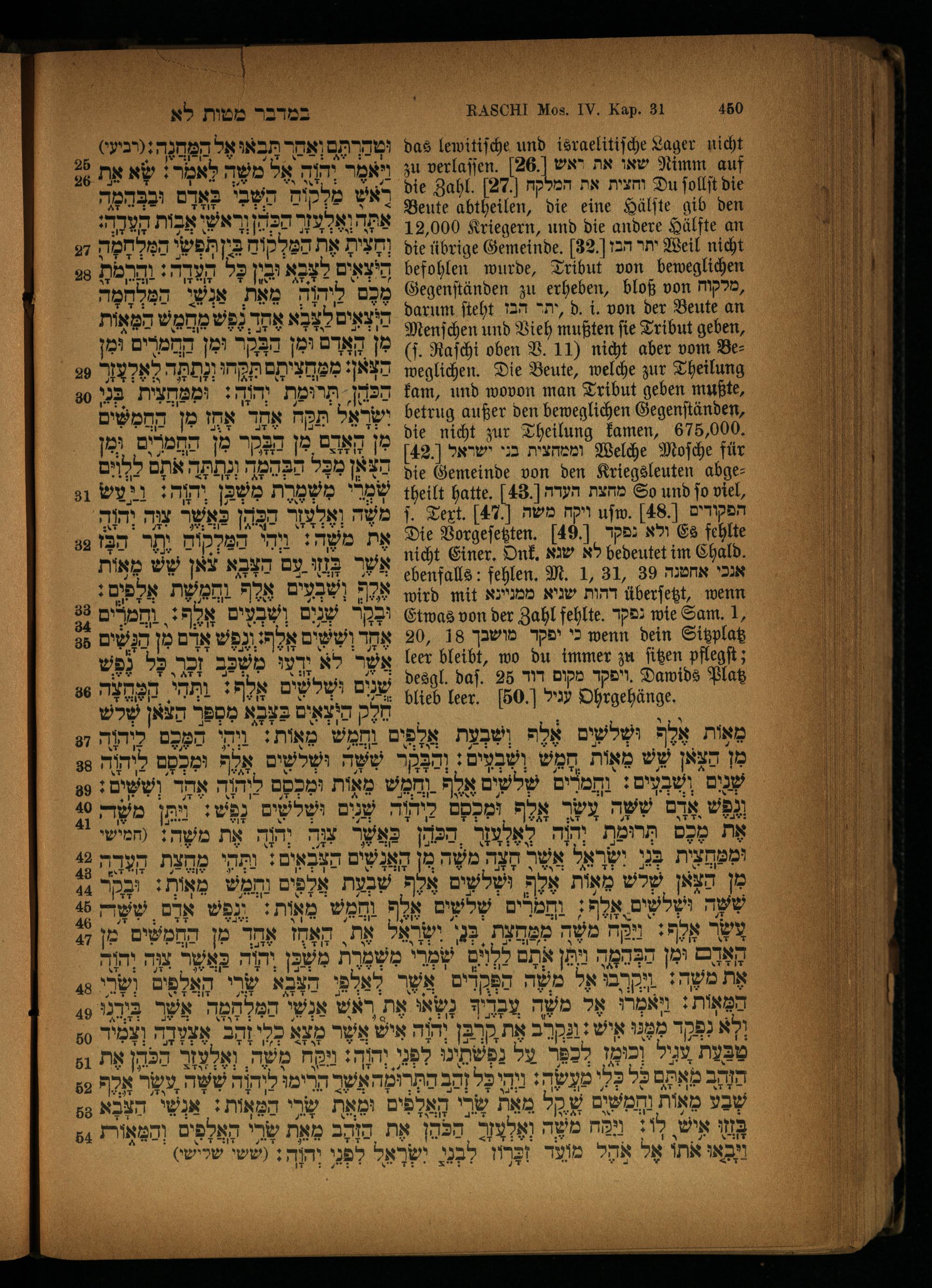 das lewitiſche und israelitiſche Lager nicht zu verlaſſen. 26. שאו את ראש Nimm auf die Zahl. 27 וחצית את המלקח Du ſollſt die Beute abtheilen, die eine Hälſte gib den 19,000 Kriegern, und die andere Hälfte an die übrige Gemeinde. 32 יתר הבז Weil nicht befohlen wurde, Tribut von beweglichen Gegenſtänden zu erheben, bloß von ,מלקוח darum ſteht הבז In, d. i. von der Beute an Menſchen und Vieh mußten ſie Tribut geben, (ſ. Raſchi oben V. 11) nicht aber vom Beweglichen. Die Beute, welche zur Theilung kam, und wovon man Tribut geben mußte, betrug außer den beweglichen Gegenſtänden, die nicht zur Theilung kamen, 675,090. 42] וממחצית בני ישראל Welche Moſche für die Gemeinde von den Kriegsleuten abgetheilt hatte. 43. מחצת העדה So und fo viel, ſ. Text. 47] ויקח משה uſw.]48.[ הפקודים Die Vorgeſetzten. 49.) ולא נפקד Es fehlte nicht Einer. Onk. לא שגא bedeutet im Chald. ebenfalls: fehlen. M. 1, 31, 39 אנכי אחטנה wird mit דהות שגיא ממניינא überſetzt, wenn Etwas von der Zahl fehlte. Pen; wie Sam. 1, 20, 18 כי יפקד מושבך wenn dein Sitzplatz leer bleibt, wo du immer zu ſitzen pflegſt; desgl. daſ. 25.ויפקד מקום דוד Dawids Platz blieb leer. 50.) עניל Dhrgehänge.