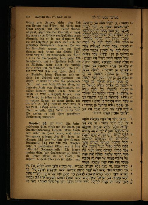 Kapitel 35. 2 a Ein freier, unbebauter Platz rings um die Stadt, zur Stadtverſchönerung dienend. Man durfte dort weder ein Haus bauen, noch einen Weingarten anlegen oder ihn ſonſt bepflanzen. 3. ולכל חיתם Für ihre LebensBedürfniſſe. 4 אלף אמה סביב Nachher heißt es zweitauſend Ellen, wie il dies? erklärlich? Folgenderweiſe: Die innern tauſend Ellen(zur Stadtmauer zu) bleiben als leerer Raum um die Stadt; die äußeren tauſend Ellen ſind für Jelder und