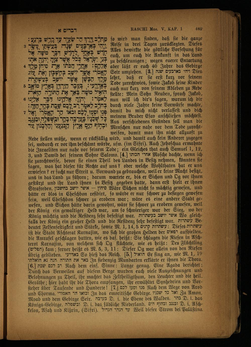 weiſen, damit man ihn nicht allzuoft zu Rede ſtellen müße, wenn er rückfällig wird, und damit auch kein Anderer zugegen ſei, wodurch er vor ihm beſchämt würde, uſw.(im Sifri). Auch Jehoſchua ermahnte die Israeliten nur nahe vor ſeinem Tode; ein Gleiches that auch Samuel 1, 12, 3, und Dawid bei feinem Sohne Salomo. 4 אחרי הכותו Moſche dachte, wenn ich fie zurechtweiſe, bevor fie einen Theil des Landes in Beſitz nehmen, könnten fie ſagen, was hat dieſer für Rechte auf uns? oder welche Wohlthaten hat er uns erwiefen? er fucht nur Streit u. Vorwand zu gebrauchen, weil er keine Macht beſitzt, uns in das Land zu führen; darum wartete er, bis er Sichon und Og vor ihnen geſtürzt und ihr Land ihnen in Befig gegeben hatte, dann erſt hielt er ihnen Strafreden. סיחון— אשר יושב בחשבון Wäre Sichon nicht fo mächtig geweſen, und hätte er blos in Cheſchbon reſidirt, ſo würde er nur ſchwer zu beſiegen geweſen fein, weil Cheſchbon ſchwer zu erobern war; wäre es eine andere Stadt geweſen, und Sichon hätte darin gewohnt, wäre ſie ſchwer zu erobern geweſen, weil der König ein gewaltiger Held war, um ſo ſchwieriger war der Sieg, wo der König mächtig und die Reſidenz ſehr befeſtigt war. אשר יושב בעשתרות Wo gleichfalls der König ein großer Held und die Reſidenz ſehr befeſtigt war. עשתרות Bedeutet Felſenfeſtigkeit und Stärke, ſowie M. 1, 14, 5 עשתרות קרנים: Dieſes עשתרות iſt die Stadt Aſchterat Karnajim, wo ſich die großen Helden der רפאים aufhielten, die Amrafel geſchlagen hatten, wie es daf. heißt: Sie ſchlugen die Rieſen in Aſchterot Karnaſim, von welchem ſich Og flüchtete, wie es heißt: Der Flüchtling (הפליט) kam; ferner heißt es M. 5, 3, 11: Dieſer Og war allein von den Rieſen übrig geblieben. באדרעי So hieß das Reich. 5. הואיל Er fing an, wie M. 1, 19 באר את התורה.הנה נא הואלתי In ſiebenzig Mundarten erklärte er ihnen die Thora. 6 na רב לכם Nach dem einf. Sinne: Lange genug. Eine Agada berichtet Durch das Verweilen auf dieſem Berge wurden euch viele Auszeichnungen und Belohnungen zu Theil, ihr machtet das Zeltheiligthum, den Leuchter und die heil. Geräthe; hier habt ihr die Thora empfangen, ihr erwähltet Synhedrien und Vorſteher über Tauſende und Hunderte! 7. מנו וסעו לכם Nach dem Wege von Arod und Chorma. ובואו הר האמודי In das emoritiſche Gebirge. wor, ואל כל Zu Amon, Moab und dem Gebirge Seir. בערבה D. i. die Ebene des Waldes. בהר i. das Königs⸗Gebirge. ובשפלה D. i. das ſüdliche Niederland. ובנגב ובחוף הים Dei. Aſchkelon, Aſah und Kißrin,(Sifrih. wan עד הנהר Weil dieſer Strom bei Paläſtina
