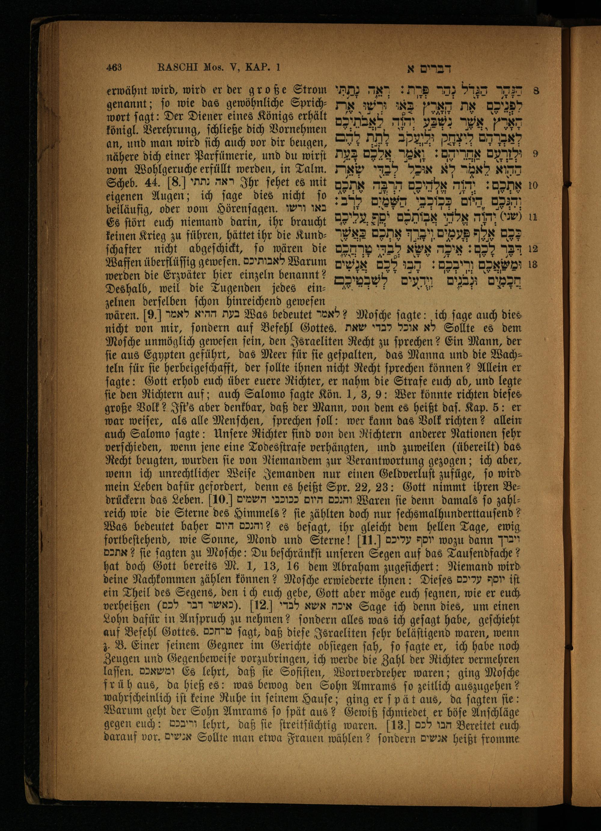 wären. 9. בעת ההיא לאמר Was bedeutet?לאמר Moſche ſagte: ich ſage auch dies nicht von mir, ſondern auf Befehl Gottes. לא אוכל לבדי שאת Sollte es dem Moſche unmöglich geweſen ſein, den Israeliten Recht zu ſprechen? Ein Mann, der ſie aus Egypten geführt, das Meer für ſie geſpalten, das Manna und die Wachteln für ſie herbeigeſchafft, der ſollte ihnen nicht Recht ſprechen können? Allein er ſagte: Gott erhob euch über euere Richter, er nahm die Strafe euch ab, und legte fie den Richtern auf; auch Salomo ſagte Kön. 1, 3, 9: Wer könnte richten dieſes große Volk? Iſt's aber denkbar, daß der Mann, von dem es heißt daſ. Kap. 5: er war weiſer, als alle Menſchen, ſprechen ſoll: wer kann das Volk richten? allein auch Salomo ſagte: Unſere Richter ſind von den Richtern anderer Nationen ſehr verſchieden, wenn jene eine Todesſtrafe verhängten, und zuweilen(übereilt) das Recht beugten, wurden ſie von Niemandem zur Verantwortung gezogen; ich aber, wenn ich unrechtlicher Weiſe Jemanden nur einen Geldverluſt zufüge, ſo wird mein Leben dafür gefordert, denn es heißt Spr. 22, 23: Gott nimmt ihren Bedrückern das Leben.]10.[ והנכם היום ככוכבי השמים Waren fie denn damals fo zahlreich wie die Sterne des Himmels? ſie zählten doch nur ſechsmalhunderttauſend? Was bedeutet baher?והנכם היום es beſagt, ihr gleicht dem hellen Tage, ewig fortbeſtehend, wie Sonne, Mond und Sterne! il.) יוסף עליכם wozu dann ויברך אתכם? fie ſagten zu Moſche: Du beſchränkſt unſeren Segen auf das Tauſendfache? hat doch Gott bereits M. 1, 13, 16 dem Abraham zugeſichert: Niemand wird deine Nachkommen zählen können? Moſche erwiederte ihnen: Dieſes עליכם ADV iſt ein Theil des Segens, den ich euch gebe, Gott aber möge euch ſegnen, wie er euch verheißen איכה אשא לבדי]12.(כאשר דבר לכם) Sage ich denn dies, um einen Lohn dafür in Anſpruch zu nehmen? ſondern alles was ich geſagt habe, geſchieht auf Befehl Gottes. טרחכם ſagt, daß dieſe Israeliten ſehr beläſtigend waren, wenn z B. Einer ſeinem Gegner im Gerichte obſiegen ſah, ſo ſagte er, ich habe noch Zeugen und Gegenbeweiſe vorzubringen, ich werde die Zahl der Richter vermehren laſſen. ומשאכם Es lehrt, daß fie Sofiſten, Wortverdreher waren; ging Moſche früh aus, da hieß 68: was bewog den Sohn Amrams fo zeitlich auszugehen? wahrſcheinlich iſt keine Ruhe in ſeinem Hauſe; ging er ſpät aus, da ſagten ſie: Warum geht der Sohn Amrams fo ſpät aus? Gewiß ſchmiedet er böſe 76 gegen euch: 222°) lehrt, daß fie ſtreitſüchtig waren. 13. הבו לכם Bereitet euch darauf vor. אנשים Sollte man etwa Frauen wählen? ſondern אנשים heißt fromme