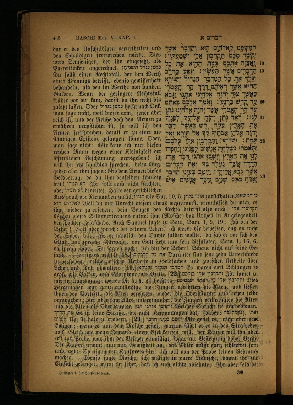 behandeln, als den im Werthe von hundert Gulden. Wenn der geringere Rechts ja früher vor dir. darfſt du ihn nicht bis; zuletzt laſſen. Oder כקטן כנדול heißt nach Onk. man ſage nicht, weil. arm, jener aber reich iſt, und der Reiche doch den Armen zu ernähren verpflichtet iſt, ſo will ich den Armen freiſprechen, damit er zu einer anſtändigen Exiſtenz gelangen könne. Oder, man fage nicht: Wie kann ich nur dieſen reichen Mann wegen einer Kleinigkeit der öffentlichen Beſchämung preisgeben! ich will ihn jetzt ſchuldlos ſprechen, beim Weg: gehen aber ihm ſagen: Gib dem Armen dieſen Geldbel trag, da du ihm denſelben ſchuldig biſt! nn לא Ihr ſollt euch nicht fürchten, oder n לא bedeutet: Halte den gerichtlichen Aus ſpruch vor Niemanden zurück, nn wie Spr. 10, 5. אוגר בקי"ן zurückhalten. xk. לאלהים הוא Weil du mit Unrecht dieſem etwas wegnimmſt, veranlaſſeſt du mich, es ihm wieder zu erſetzen; dein. des Rechts betrifft alſe mich תקריבון אלי ה dieſes Selbſtvertrauens entfiel ihm(Moſche) das Urtheil in Angelegenheit chter⸗ Zelafchads. Auch Samuel ſagte zu Saul, Sam. 1, 9, 19: Ich bin der Seher. Gott aher ſprach: bei deinem Leben! ich werde dir beweiſen, daß du nicht der Seher hiſt. gls*r nämlich den Dawid ſalben wollte, da ſah er vor ſich den Eliah, and 190 Fürwahr, vor Gott ſteht nun fein Geſalbter, Sam. 1, 6, da. Salt,„Du ſagteſt doch; Ich bin der Seher! Schaue nicht auf ſeine Geſtalt.(er ſiſt es nicht) 18] את כל הדברום Darunter find jene zehn Unterſchiede ZU סט welche וג וטו lg in Geldſachen und zwiſchen Urtheile über Leben, und, Tod öbwalten. 19. g nm, aaa המדבר Es waren dort Schlangen fo groß. wie Balken, und Skorpione, wie Pfeile 22 ותקרבון אלי בולכם Ihr kamet zu mir in Lugronnng; weiter Hö. ß, g, A6 heißt es ותקרבון אלי כל,ראשי שבמיכם% Hergnnahen was gu ni anſtändig, die Jungen verehrten die Alten, und ließen ihnen den Vortritt, die Alten perehrten wieder die berhäuyter und ließen ſelbe vorgugchen, hier aber gm Alles untereinander, die Jungen verdrängten die Alten und die Alten die Oberhäupter. 237 אותנו Her Melden Sprache ſie ſich bedtenen. kan את Es iſt keine Straße, die nicht Krümmungen hat,(daher: בה n). ואת הערים Um ſie hald zu erobern, 33 hM ar, Mir gefiel es, nicht aber hem Ewigen; wenn es nun dem Moſche gefiel, warum führt er es in den Strafreden an? Gleich wie wenn Femand einen Eſel kaufen will, der Käufer will ihn aber erſt zur Probe, was ihm der Beſitzer einwilligt, ſogar zur Beſteigung hoher Berge. Der Käufer nimmt nun mit, Gewißheit an, das Thier müſſe ganz fehlerfrei ſein und ſagt; So nimm den Kaufpreis hin! ich will von der Probe keinen Gebrauch machen. n Ebenſo fagte Moſche, ich willigte in euere Wünſche, damit ihr zur Einſicht gelanget, wenn ihr ſehet, daß ich euch nichts ablehnte; Ihr aber ſeid bei
