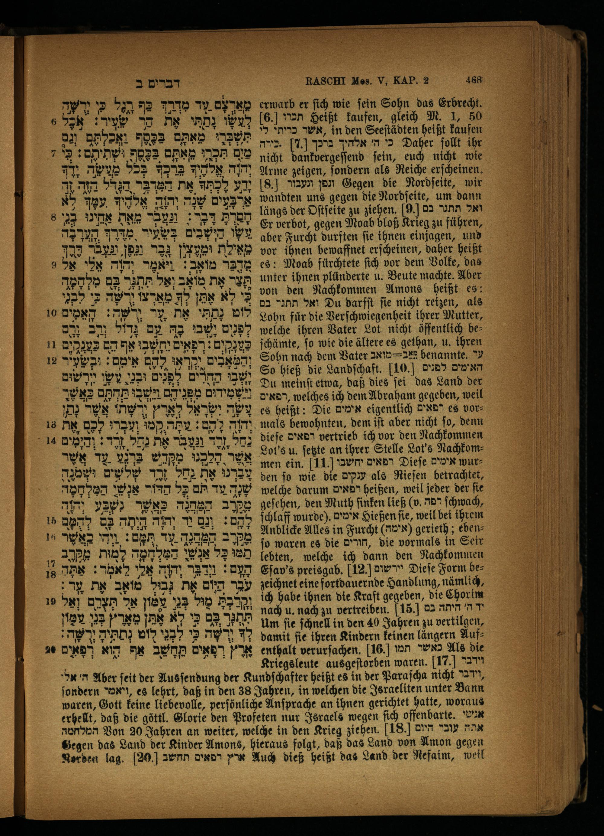 erwarb er ſich wie fein Sohn das Erbrecht. 6. תכרו Heißt kaufen, gleich M. 1, 50 אשר כריתי לי, in den Seeſtädten heißt kaufen Tr.[7.] כי ה' אלהיך ברכך Daher ſollt ihr nicht dankvergeſſend ſein, euch nicht wie Arme zeigen, ſondern als Reiche erſcheinen. 8. נעבור ſon Gegen die Nordſeite, wir wandten uns gegen die Nordſeite, um dann längs der Oſtſeite zu ziehen. 9. ואל תתגר בם Er verbot, gegen Moab bloß Krieg zu führen, aber Furcht durften ſie ihnen einjagen, und vor ihnen bewaffnet erſcheinen, daher heißt es: Moab fürchtete ſich vor dem Volke, das unter ihnen plünderte u. Beute machte. Aber von den Nachkommen Amons heißt es: ואל תתנר בם Du darfſt fie nicht reizen, als Lohn für die Verſchwiegenheit ihrer Mutter, welche ihren Vater Lot nicht öffentlich beſchämte, ſo wie die ältere es gethan, u. ihren Sohn nach dem Vater מאב-=מואב benannte. ער So hieß die Landſchaft. 10. האימים לפנים Du meinſt etwa, daß dies ſei das Land der רפאים, welches ich dem Abraham gegeben, weil es heißt: Die אימים eigentlich רפאים es vormals bewohnten, dem iſt aber nicht ſo, denn dieſe רפאים vertrieb ich vor den Nachkommen Lot's u. ſetzte an ihrer Stelle Lot's Nachkommen ein. 11] רפאים יחשבו Dieſe אימים wurden fo wie die ענקים als Rieſen betrachtet, welche darum רפאים heißen, weil jeder der fie geſehen, den Muth ſinken ließ(.. 757 ſchwach, ſchlaff wurde). אימים Hießen fie, weil bei ihrem Anblicke Alles in Furcht(אימה) gerieth; ebenjo waren es die ,חורים die vormals in Seir lebten, welche ich dann den Nachkommen Eſay's preisgab. 12. יירשום Dieſe Form bezeichnet eine fortdauernde Handlung, nämlich, ich habe ihnen die Kraft gegeben, die Ehorim nach u. nach zu vertreiben. 15. יד היהיתה בם Um ſie ſchnell in den 40 Jahren zu vertilgen, damit fie ihren Kindern keinen längern Aufenthalt verurſachen. 16] כאשר תמו Als die Kriegsleute ausgeſtorben waren.]17.["27
