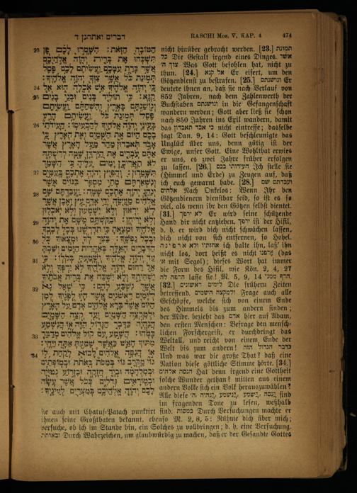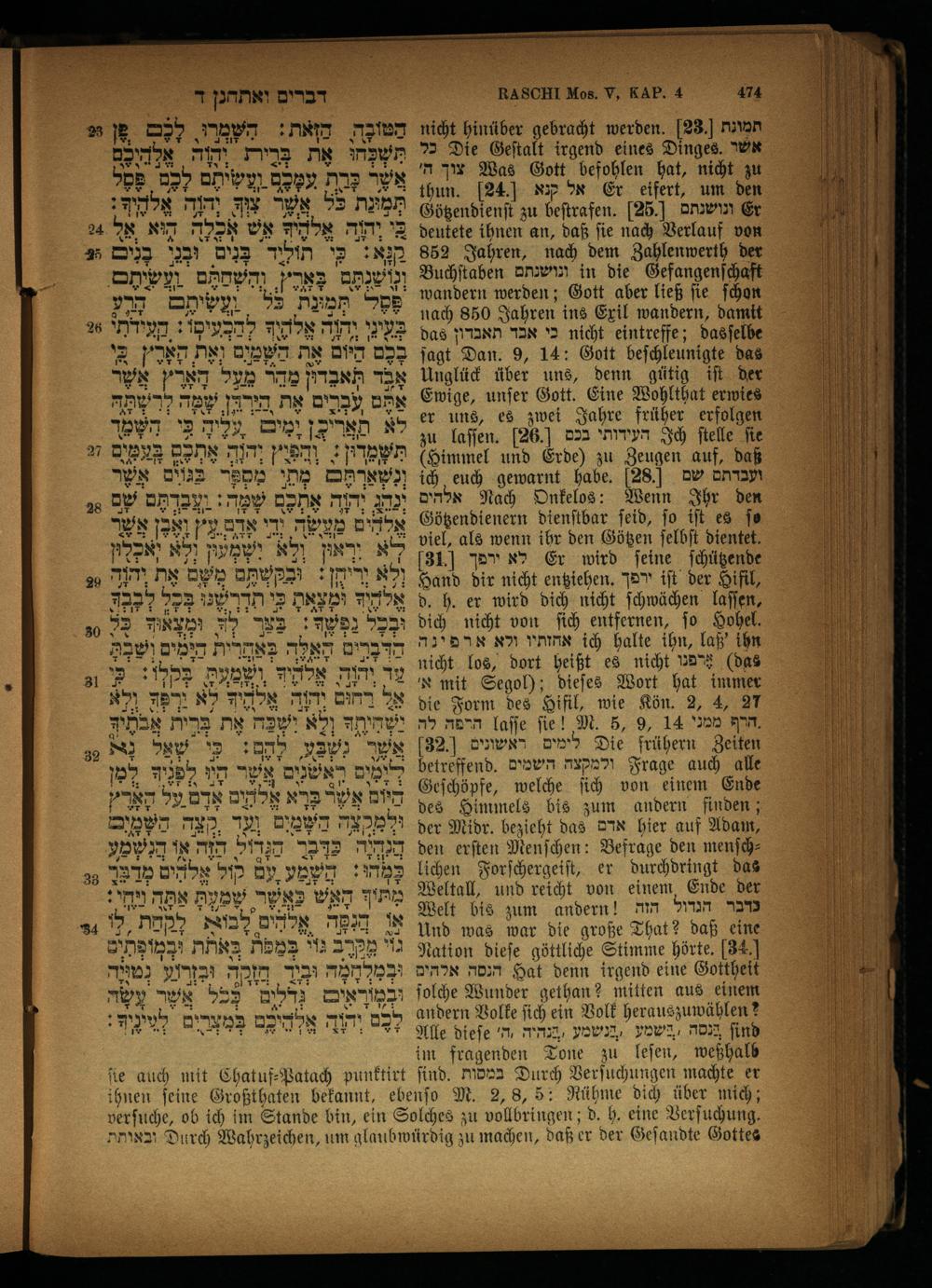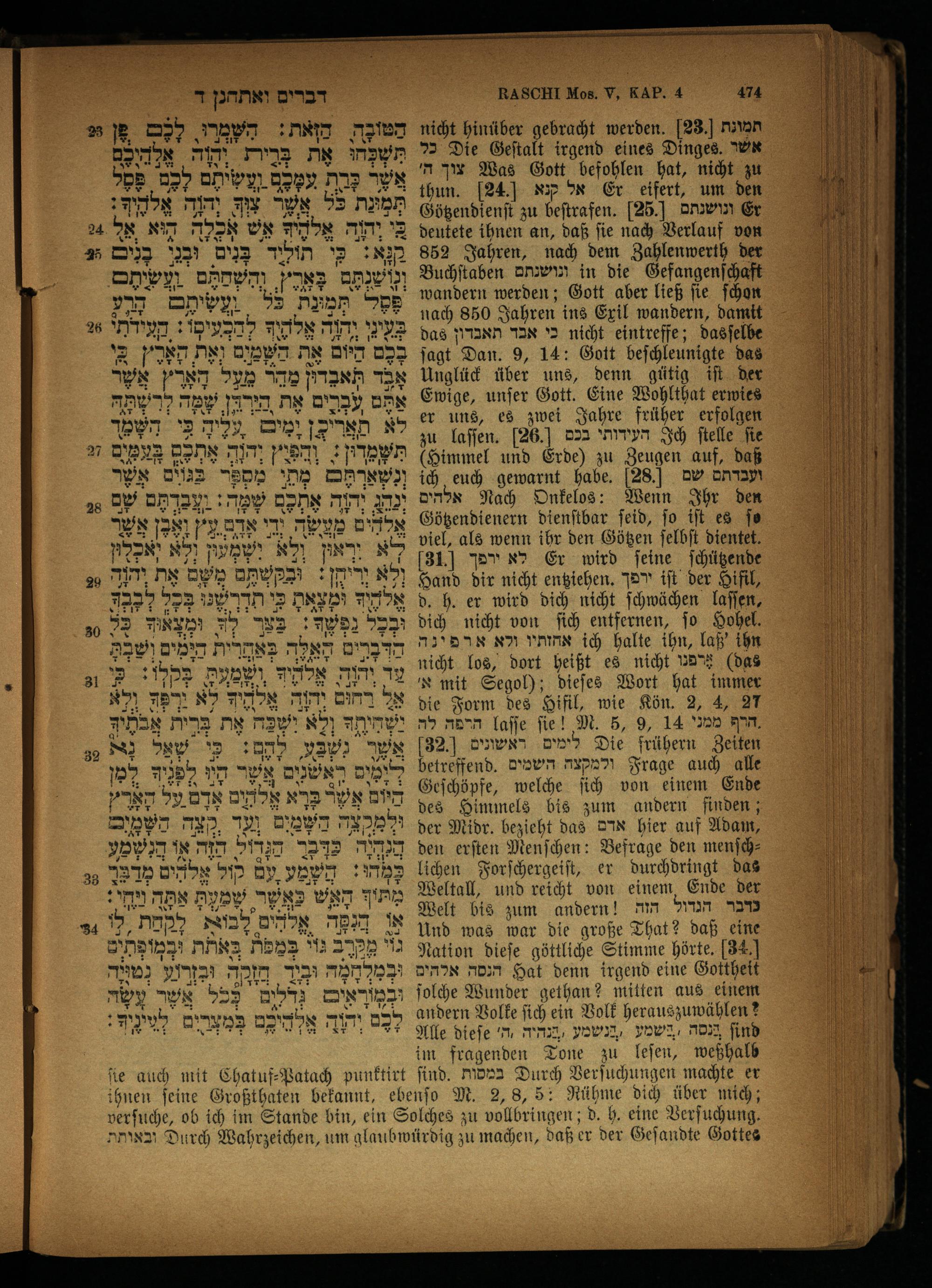 nicht hinüber gebracht werden. 23. תמונת כל Die Geſtalt irgend eines Dinges. אשר צוך ה' Was Gott befohlen hat, nicht zu m thun. 24. אל נא Er eifert, um den H Götzendlenſt zu beſtrafen. 25. ונושנתם Er deutete ihnen an, daß ſie nach Verlauf von 852 Jahren, nach dem Zahlenwerth der Buchſtaben נושנתם in die Gefangenſchaft wandern werden; Gott aber ließ ſie ſchon nach S50 Jahren ins Exil wandern, damit das תאבדון 3x כי nicht eintreffe; das ſelbe ſagt Dan. 9, 14: Gott beſchleunigte das Unglück über uns, denn gütig iſt der x Ewige, unſer Gott. Eine Wohlthat erwies er uns, es zwei Jahre früher erfolgen zu laſſen. 26. העידות' בכם Ich ſtelle fie (Himmel und Erde) zu Zeugen auf, daß ich euch gewarnt habe. 28.) ועבדתם שם אלהים Nach Onkelos: Wenn Ihr den Götzendienern dienſtbar ſeid, ſo iſt es ſo ö als wenn ihr den Götzen ſelbſt dientet.