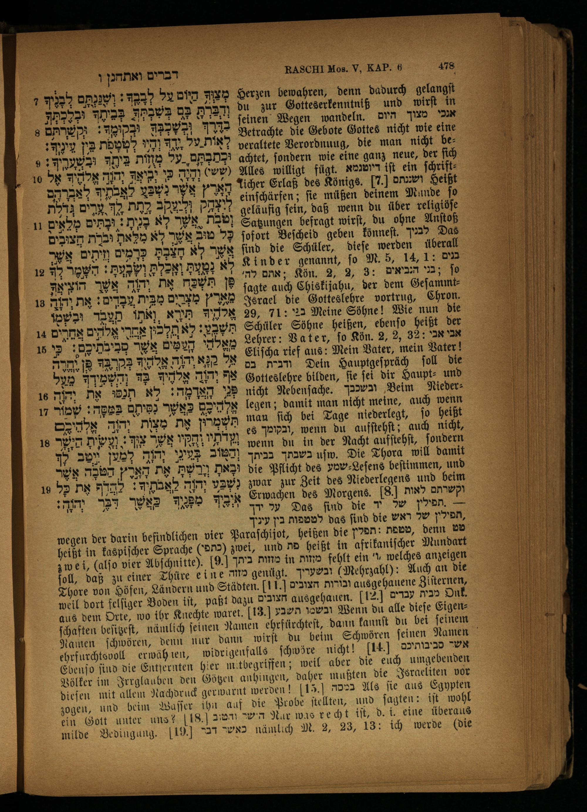 RASCHI Mos. V, KAP. 6 478 Herzen bewahren, denn dadurch gelangſt du zur Gotteserkenntniß und wirſt in ſeinen Wegen wandeln. אנכי מצוך היום Betrachte die Gebote Gottes nicht wie eine veraltete Verordnung, die man nicht be: achtet, ſondern wie eine ganz neue, der ſich Alles willigt fügt. דיוטגמא iſt ein ſchriftLicher Erlaß des Königs.[7.] ושננתם einſchärfen; ſie müßen deinem Munde ſo geläufig ſein, daß wenn du über religiöſe Satzungen befragt wirſt, du ohne Anſtoß ſofort Beſcheid geben könneſt. לבניך% find die Schüler, dieſe werden überall Kinder genannt, fo M. 5, 14, 1: בנים ;אתם להי Kön. 2, 3, 3: dnn: R; ſo ſagte auch Chiskijahu, der dem GeſammtIsrael die Gotteslehre vortrug, Chron. 29, 71: 22 Meine Söhne! Wie nun die Schüler Söhne heißen, ebenſo heißt der Lehrer: Vater, fo Kön. 2, 2, 32: אבי אבי Eliſcha rief aus: Mein Vater, mein Vater! ודבית בם Dein Hauptgeſpräch fol die Gotteslehre bilden, ſie ſei dir Haupt⸗ und nicht Nebenſache. WR Beim Niederlegen; damit man nicht meine, auch wenn man ſich bei Tage niederlegt, ſo heißt es ,ובקומך wenn du aufſtehſt; auch nicht, wenn du in der Nacht aufſtehſt, ſondern בשבתך בביתך uſw. Die Thora will damit die Pflicht des YHW-Lefens beſtimmen, und zwar zur Zeit des Niederlegens und beim Erwachen des Morgens. 8] וקשרתם לאות על יד Das find die של יד Jon. בין עיגיך madd das find die ,תפילין של ראש