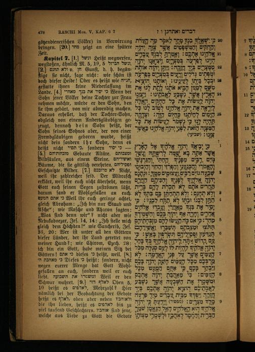 Kapitel 7. 1. ונשל Heißt wegwerfen, wegſtoßen, ähnlich M. 5, 19, 5 הברזל vn. [2.] ולא תחנם v. חן Gunft, d. h. begünſtige fie nicht, ſage nicht: wie ſchön iſt doch dieſer Heide! Oder es heißt wie ,חנייה geftalte ihnen keine Niederlaſſung im Lande.]4.[ מאחרי i כי יסיר את Wenn der Sohn jener Völker deine Tochter zur Frau nehmen möchte, würde er den Sohn, den ſie ihm gebärt, von mir abwendig machen. Daraus erhellet, daß der Tochter-Sohn, obgleich von einem Andersgläubigen gezeugt, dennoch dein Sohn heißt, der Sohn ſeines Sohnes aber, der von einer Fremdgläubigen geboren wurde, heißt nicht dein ſondern ihr Sohn, denn es heißt nicht won, ſondern Ten— 4 מזבחותיהם Gebaute Altäre. ומצבותם