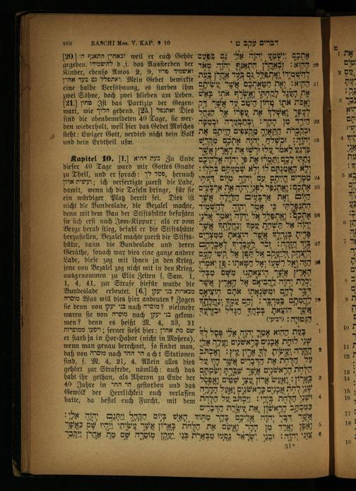 Kapitel 10. I. בעת ההיא Zu Ende dieſer 40 Tage ward mir Gottes Gnade zu Theil, und er ſprach: לך 705, hernach, ארון wren; ich verfertigte zuerſt die Lade, damit, wenn ich die Tafeln bringe, für fie ein würdiger Platz bereit ſei. Dies iſt nicht die Bundeslade, die Bezalel machte, denn mit dem Bau der Stiftshütte befaßten ſie ſich erſt nach Jom⸗Kippur; als er vom Berge herab ſtieg, befahl er die Stiftshütte herzuſtellen, Bezalel machte zuerſt die Stiftshütte, dann die Bundeslade und deren ם Geräthe, ſonach war dies eine ganze andere Lade, dieſe zog mit ihnen in den Krieg, jene von Bez alel zog nicht mit in den Krieg, ausgenommen zu Elis Zeiten ſ. Sam. 1, 1, 4, 41, zur"Strafe hiefür wurde die Bundeslade erbeutet. 6. מבארות בני יעקן מוסרה Was will dies hier andeuten? Zogen fie denn von בני יעקן nach ww? vielmehr 3 waren ſie von מוסרה nach יעקן nn gekommen? denn es heißt M. 4, 35, 31 ויסעו ממוסרות; ferner ſteht hier: שם מת אהרן er ſtarb ja in Hor⸗ Hahor(nicht in Moßera), wenn man genau berechnet, ſo findet man, daß von מוסרה nach wn wacht Stationen ſind, ſ. M. 4, 21, 4. Allein alles dies gehört zur Strafrede, nämllch: auch das habt ihr gethan, als Aharon zu Ende der 40 Jahre in החר M geſtorben und das Gewölk der Herrlichkeit euch verlaſſen hatte, da befiel euch Furcht, mit dem