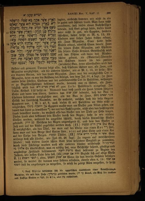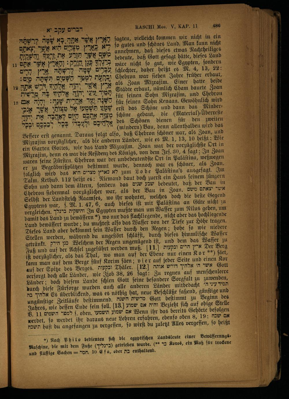 als die anderen Länder, wie es M. 1, 13, 10 heißt: Wie ein Garten Gottes, wie das Land Mizrajim. Zoan war der vorzüglichſte וכו in Mizrajim, denn es war die Reſidenz des Königs, von dem Jeſ. 30, 4 ſagt; In Zoan waren ſeine Fürſten. Chebron war der unbedeutendſte Ort in Paläſtina, weßwegen er zu Begräbnißplätzen beſtimmt wurde, dennoch war es ſchöner, als Zoan, folglich wird das לא כארץ מצרים היא zum Lobe Paläſtina's ausgeſagt. Im Talm. Kethub. 112 heißt es: Niemand baut doch zuerſt ein Haus ſeinem jüngern Sohn und dann dem ältern, ſondern das שבע שנים bedeutet, daß der Bau in Chebron ſiebenmal vorzüglicher war, als der Bau in Zoan. אשד יצאתם משם Selbſt der Landſtrich Raamſes, wo ihr wohntet, welches doch die beſte Gegend Egyptens war, ſ. M. 1. 47, 6, auch dieſes iſt mit Paläſtina an Güte nicht zu vergleichen. 72273 והשקית In Egypten mußte man um Waſſer zum Nilus gehen, um damit das Land zu bewäſſern*) wo nur das flachliegende, nicht aber das hochliegende Land bewäſſert wurde; du mußteſt alſo das Waſſer von der Tiefe zur Höhe tragen. Dieſes Land aber bekömmt ſein Waſſer durch den Regen; hohe ſo wie niedere Stellen werden, während du ungeſtört ſchläfſt, durch dieſes himmliſche Waſſer getränkt. כנן הירק Welchem der Regen ungenügend iſt, und dem das Waſſer zu Fuß und auf der Achſel zugeführt werden muß. 11 ארץ הרים ובקעות Der Berg iſt vorzüglicher, als das Thal, wo man auf der Ebene nur einen Kor**) ſäet, kann man auf dem Berge fünf Korim ſäen; v ier auf jeder Seite und einen Kor auf der Spitze des Berges. ובקעות Thäler. 12 אשר ה' אלהיך דורש אותה Gott verſorgt doch alle Länder, wie Jjob 38, 26 jagt: Zu regnen auf menſchenleere Länder; doch dieſem Lande ſchien Gott ſeine beſondere Sorgfalt zu zuwenden, durch dieſe Fürſorge wurden auch alle anderen Länder mitbedacht 77 תמיד אלהיך בה Es überblicfend, was es nöthig hat, neue Beſchlüße faßend, günſtige und ungünſtige Zeitläufe beſtimmend. מרשית השנה Gott beſtimmt zu Beginn des Jahres, wie deſſen Ende ſein ſoll. 13. והיה אם שמוע Bezieht ſich auf obige Stelle NR. 11 השמים*r ſ. oben. אם שמוע תשמעו Wenn ihr das bereits Gehörte befolgen werdet, ſo werdet ihr daraus neue Lehren erfahren, ebenſo oben 8, 19: אם שכח תשכת haft du angefangen zu vergeſſen, ſo wirſt du zuletzt Alles vergeſſen, ſo heißt