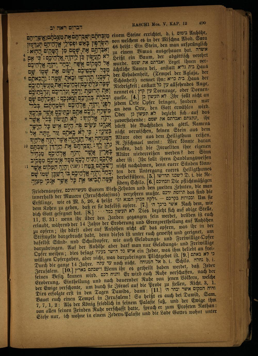 aber nicht, was darzubringen Plichtgebot iſt. עד עתה noch nicht. אל המנוחה d. i. Schilo. נחלה d. i. Jerufalem. I0] וישבתם בארץ Wenn ihr es getheilt haben werdet, ſeinen Beſitz kennen wird. והניח לכם Er wird euch Eroberung, Eintheilung und nach dauernder Ruhe von jenen um durch fie Israel auf die den Tagen Dawids, dann: 11. in Jeruſalem! So heißt es auch bei Dawid, Sam. friedlich in ſeinem von allen ſeinen Feinden Ruhe verſchafft hatte, Siehe nur, ich wohne in einem Zedern ⸗Palaſte und die Lade Gottes