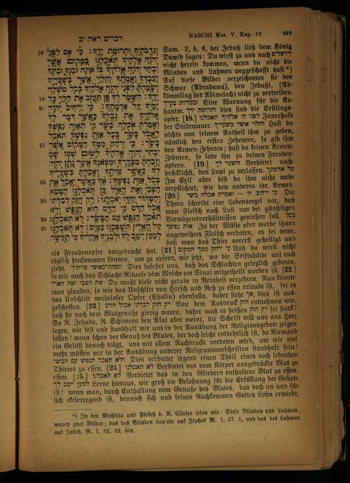 RASCHI Mos. V. Kap. 12 492 Sam. 2, 5, 6, der Jebuß ließ dem König Dawid ſagen: Du wirft zu uns nach ירושלים nicht herein kommen, wenn du nicht die Blinden und Lahmen weggeſchafft haft*( Auf dieſe Bilder verzeichneten ſie den Schwur(Abraham), den Jebußi,(Ab kö)unmling des Abimelech) nicht zu vertreiben. ובכורות בקדך Eine Warnung für die Ko⸗= hanim. ידך amm dies ſind die Erſtlings opfer.[18.] לפני ה' אלהיך. תאכלנו Innerhalb der Stadtmauer. והלוי אשר בשעריך Halt du nichts von ſeinem Antheil ihm zu geben, nämlich den erſten Zehenten, ſo gib ihm den Armen⸗Zehnten; haſt du keinen Armen| Zehnten, ſo lade ihn zu deinen Freuden opfern. 19 לך wwn Verbietet nach drücklichſt, den Lewi zu verlaſſen. n mk על Im Exil aber biſt du ihm nicht mehr verpflichtet, wie den anderen isr. Armen. 2h ואמות אכלה בשר— m em,, Die Thora ſchreibt eine Lebensregel vor, daß man Fleiſch nach Luſt nur bei günſtiigen Vermögens verhältniſſen genießen fol. 7222 נפשך MN In der Wüſte aber wurde ihnen ungeweihtes Fleiſch verboten, es ſei denn, daß man das Thier vorerſt geheiligt und Und du wirſt nicht die Stiftshütte mit euch daß das Schlachten geſetzlich.