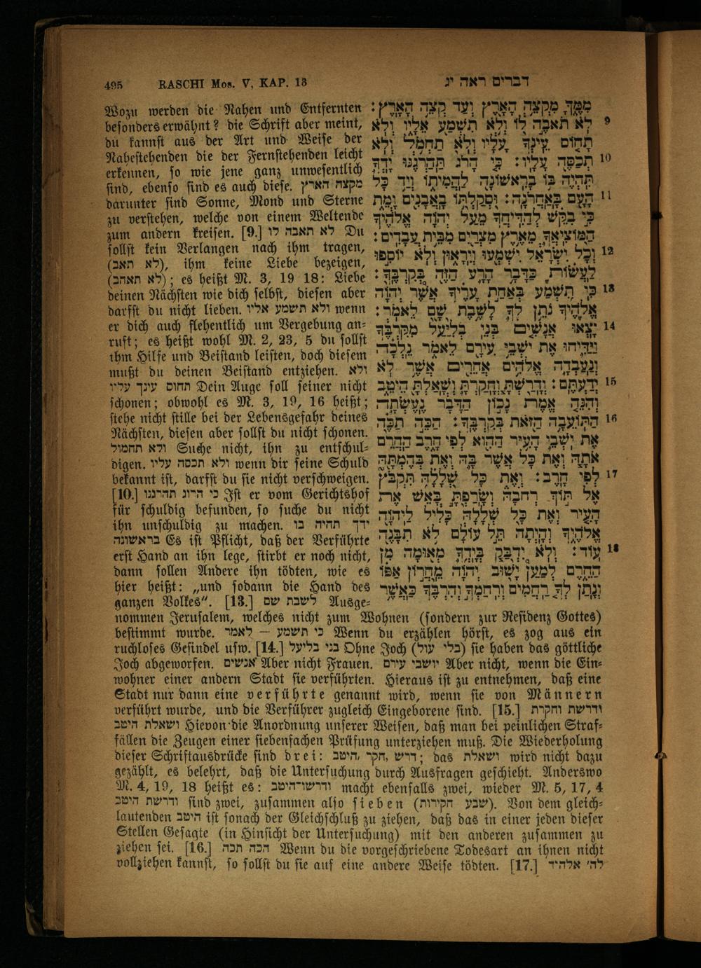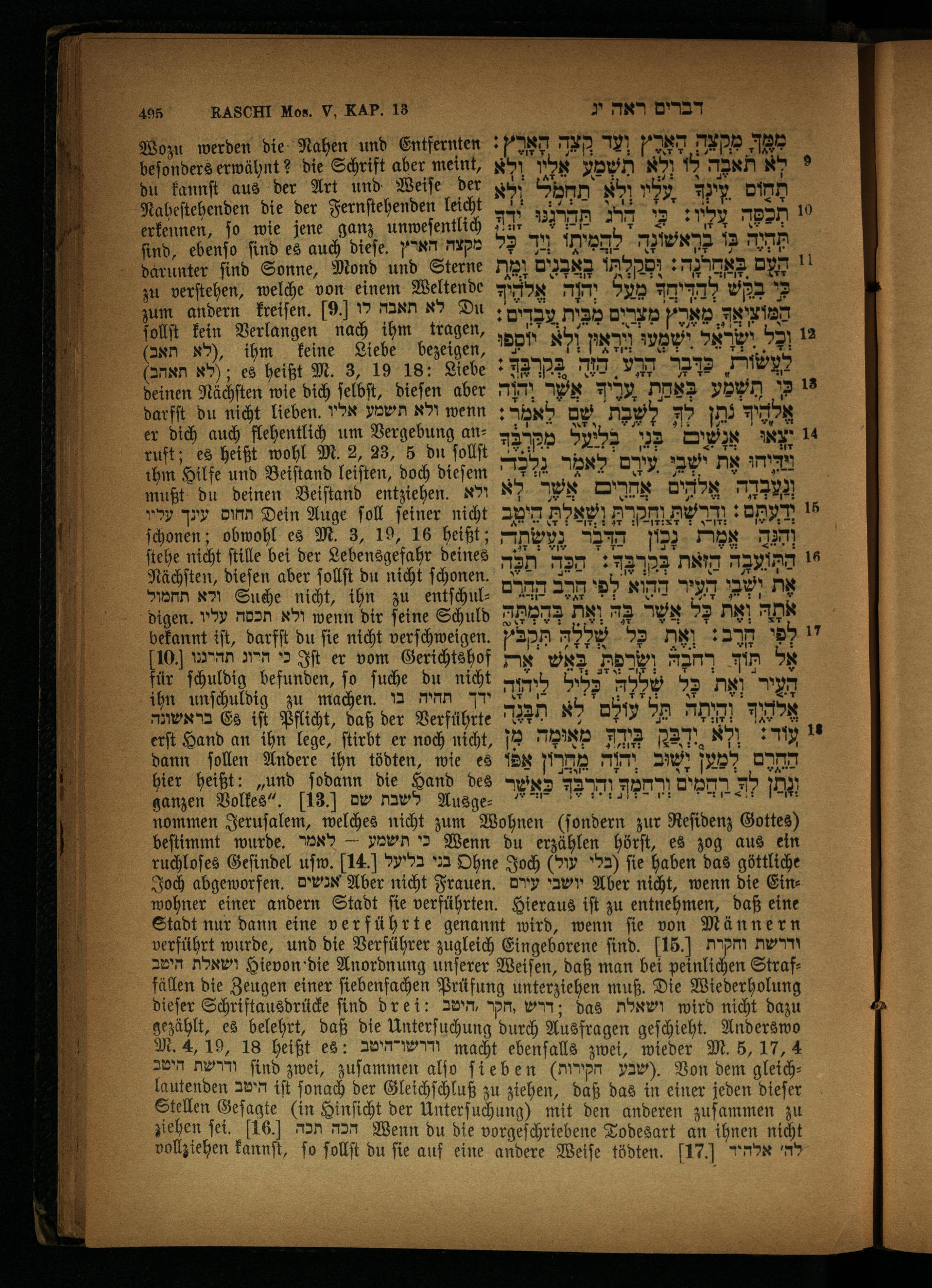 Wozu werden die Nahen und Entfernten beſonders erwähnt? die Schrift aber meint, du kannſt aus der Art und Weiſe der Naheſtehenden die der Fernſtehenden leicht erkennen, ſo wie jene ganz unweſentlich find, ebenſo find es auch dieſe, מקצה הארץ darunter ſind Sonne, Mond und Sterne zu verſtehen, welche von einem Weltende zum andern kreiſen. 9 לא תאבה לו Du follſt kein Verlangen nach ihm tragen, (לא תאב) ihm keine Liebe bezeigen, (לא תאהב); es heißt M. 3, 19 18: Liebe deinen Nächſten wie dich ſelbſt, dieſen aber darfſt du nicht lieben. ולא תשמע אליו wenn er dich auch flehentlich um Vergebung anruft; es heißt wohl M. 2, 23, 5 du ſollſt ihm Hilfe und Beiſtand leiſten, doch dieſem mußt du deinen Beiſtand entziehen. ולא תחוס עינך עליו Dein Auge fol feiner nicht ſchonen; obwohl es M. 3, 19, 16 heißt; ſtehe nicht ſtille bei der Lebensgefahr deines Nächſten, dieſen aber ſollſt du nicht ſchonen. ולא תחמול Suche nicht, ihn zu entſchuldigen. ולא תכסה עליו wenn dir ſeine Schuld bekannt iſt, darfſt du ſie nicht verſchweigen. 10] כי הרוג תהרננגו Iſt er vom Gerichtshof für ſchuldig befunden, ſo ſuche du nicht ihn unſchuldig zu machen. ידך תהיה בו בראשונה Es iſt Pflicht, daß der Verführte erſt Hand an ihn lege, ſtirbt er noch nicht, dann ſollen Andere ihn tödten, wie es hier heißt:„und ſodann die Hand des ganzen Volkes“. 13.) לשבת שם Ausge