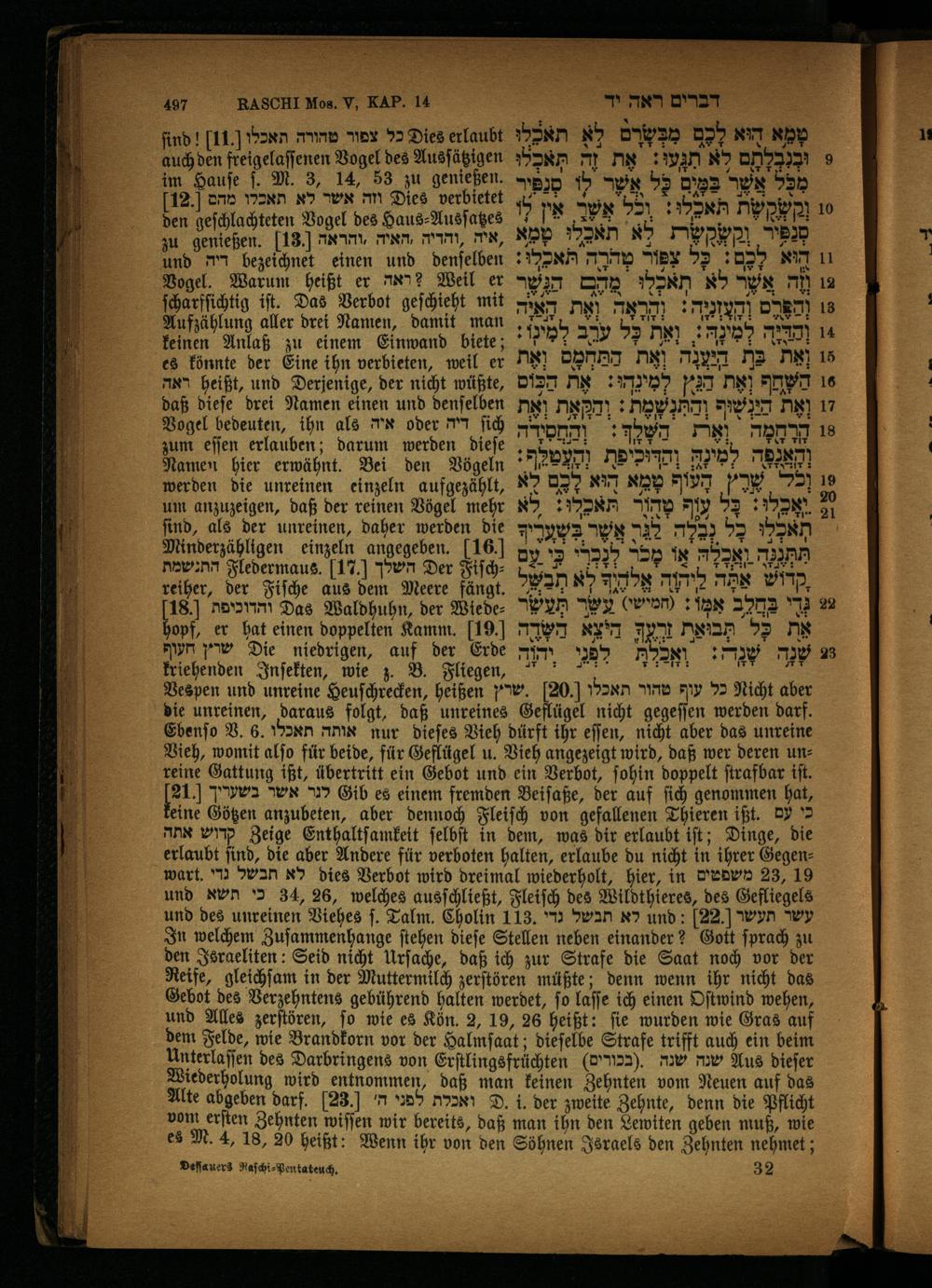 Vespen und unreine Heuſchrecken, heißen טהור תאכלו].20[.שרץ Ry כל Nicht aber die unreinen, daraus folgt, daß unreines Geflügel nicht gegeſſen werden darf. Ebenſo V. 6. אותה תאכלו nur dieſes Vieh dürft ihr eſſen, nicht aber das unreine Vieh, womit alſo für beide, für Geflügel u. Vieh angezeigt wird, daß wer deren unreine Gattung ißt, übertritt ein Gebot und ein Verbot, ſohin doppelt ſtrafbar iſt. ö לגר אשר בשעריך Gib es einem fremden Beiſaße, der auf ſich genommen hat, eine Götzen anzubeten, aber dennoch Fleiſch von gefallenen Thieren ißt. כי עם קדוש אתה Zeige Enthaltſamkeit ſelbſt in dem, was dir erlaubt iſt; Dinge, die erlaubt ſind, die aber Andere für verboten halten, erlaube du nicht in ihrer Gegenwart. M לא תבשל dies Verbot wird dreimal wiederholt, hier, in משפטים 19 und כי תשא 34, 26, welches ausſchließt, Fleiſch des Wildthieres, des Gefliegels und des unreinen Viehes ſ. Talm. Cholin 118.** לא תבשל und: 22. עשר תעשר In welchem Zuſammenhange ſtehen dieſe Stellen neben einander? Gott ſprach zu den Israeliten: Seid nicht Urſache, daß ich zur Strafe die Saat noch vor der Reife, gleichſam in der Muttermilch zerſtören müßte; denn wenn ihr nicht das Gebot des Verzehntens gebührend halten werdet, ſo laſſe ich einen Oſtwind wehen, und Alles zerſtören, fo wie es Kön. 2, 19, 26 heißt: ſie wurden wie Gras auf dem Felde, wie Brandkorn vor der Halmſaat; dieſelbe Strafe trifft auch ein beim Unterlaſſen des Darbringens von Erſtlingsfrüchten שנה שנה\(בכורים) Aus dieſer Wiederholung wird entnommen, daß man keinen Zehnten vom Neuen auf das Alte abgeben darf. 23. ואכלת לפני ה' D. i. der zweite Zehnte, denn die Pflicht ו erſten Zehnten wiſſen wir bereits, daß man ihn den Lewiten geben muß, wie es M. 4, 18, 30 heißt: Wenn ihr von den Söhnen Israels den Zehnten nehmet; Deſfauers Raſchi⸗ Pen tateuch. 32