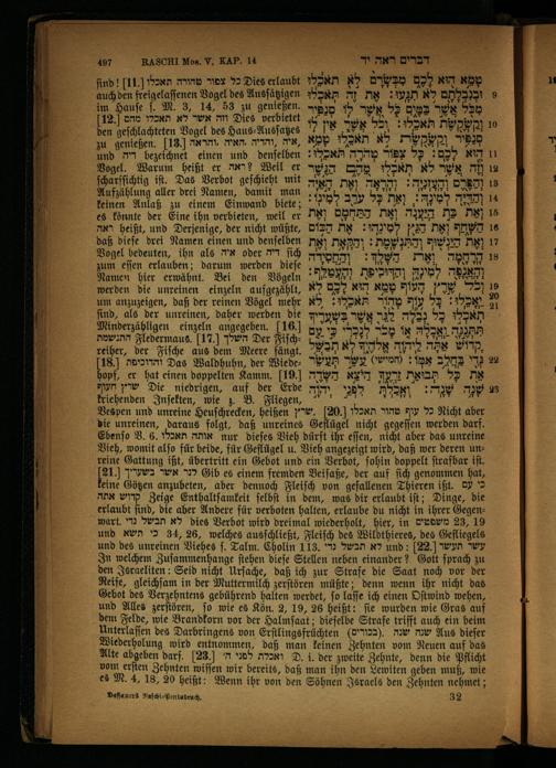 find![11.] כל צפור טהורה תאכלו Dies erlaubt auch den freigelaſſenen Vogel des Ausſätzigen im Hauſe ſ. M. 3, 14, 53 zu genießen. 12. וזה אשר לא תאכלו מהם Dies verbietet den geſchlachteten Vogel des Haus⸗Ausſatzes zu genießen. 13. ,איה ,והדיה ,האיה ,והראה und דיה bezeichnet einen und denſelben Vogel. Warum heißt er?ראה Weil er ſcharfſichtig iſt. Das Verbot geſchieht mit Aufzählung aller drei Namen, damit man keinen Anlaß zu einem Einwand biete; es könnte der Eine ihn verbieten, weil er ראה heißt, und Derjenige, der nicht wüßte, daß dieſe drei Namen einen und denſelben Vogel bedeuten, ihn als איה oder M ſich zum eſſen erlauben; darum werden dieſe Namen hier erwähnt. Bei den Vögeln werden die unreinen einzeln aufgezählt, um anzuzeigen, daß der reinen Vögel mehr ſind, als der unreinen, daher werden die Minderzähligen einzeln angegeben. 16 התנשמת Fledermaus. 17. השלך Der Fiſchreiher, der Fiſche aus dem Meere fängt. ]18.[ והדוכיפת Das Waldhuhn, der Wiedehopf, er hat einen doppelten Kamm. 19.) שרץ חעוף Die niedrigen, auf der Erde kriehenden Inſekten, wie z. B. Fliegen,