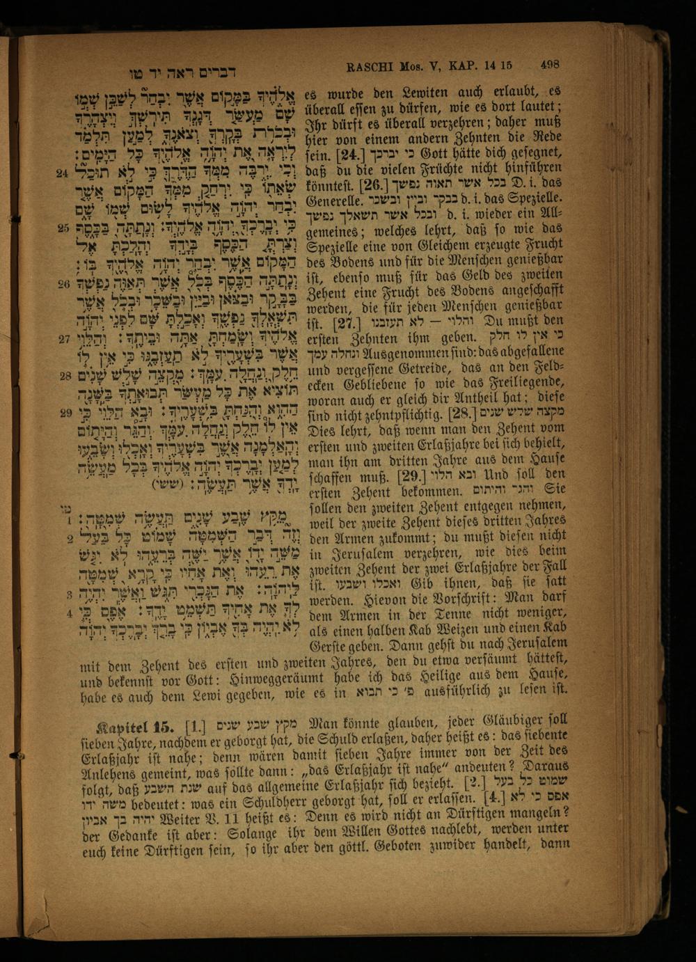 es wurde den Lewiten auch erlaubt, es überall eſſen zu dürfen, wie es dort lautet; Ihr dürft es überall verzehren; daher muß hier von einem andern Zehnten die Rede ſein. 24] כי יברכך Gott hätte dich geſegnet, daß du die vielen Früchte nicht hinführen könnteſt. 26. בכל אשר תאוה נפשך i. das Generelle. 22221 בבקר וביין d. i. das Spezielle. ובכל אשר תשאלך נפשך d. ü, wieder ein All. gemeines; welches lehrt, daß ſo wie das Spezielle eine von Gleichem erzeugte Frucht des Bodens und für die Menſchen genießbar iſt, ebenſo muß für das Geld des zweiten Zehent eine Frucht des Bodens angeſchafft werden, die für jeden Menſchen genießbar iſt. 27.) והלוי- לא תעזבנו Du mußt den erſten Zehnten ihm geben. כי אין לו חלק ונחלה עמך Ausgenommen find: das abgefallene und vergeffene Getreide, das an den Feldecken Gebliebene ſo wie das Freiliegende, woran auch er gleich dir Antheil hat; dieſe find nicht zehntpflichtig. 28. מקצה שלש שנים Dies lehrt, daß wenn man den Zehent vom ersten und zweiten Erlaßjahre bei ſich behielt, man ihn am dritten Jahre aus dem Hauſe ſchaffen muß. 29]"77 ובא Und ſoll den erſten Zehent bekommen. Rm והגר Sie ſollen den zweiten Zehent entgegen nehmen,