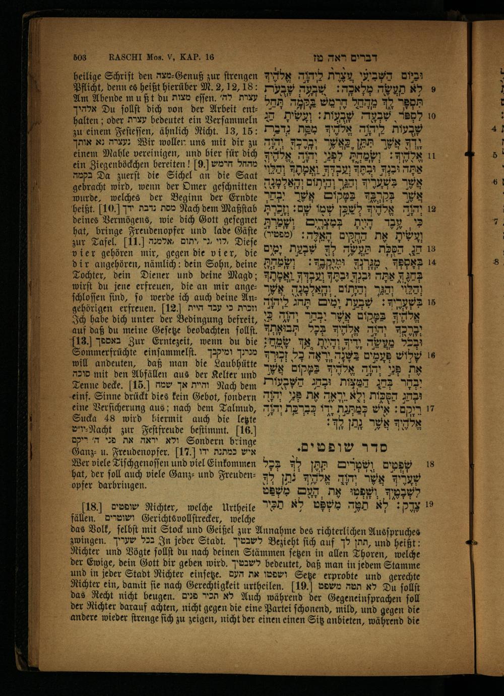 18. שופטים Richter, welche Urtheile fällen. ושוטרים Gerichtsvollſtrecker, welche das Volk, ſelbſt mit Stock und Geißel zur Annahme des richterlichen Ausſpruches zwingen. שעריך 233 In jeder Stadt. לשבטיך Bezieht ſich auf Po ,תתן und heißt: