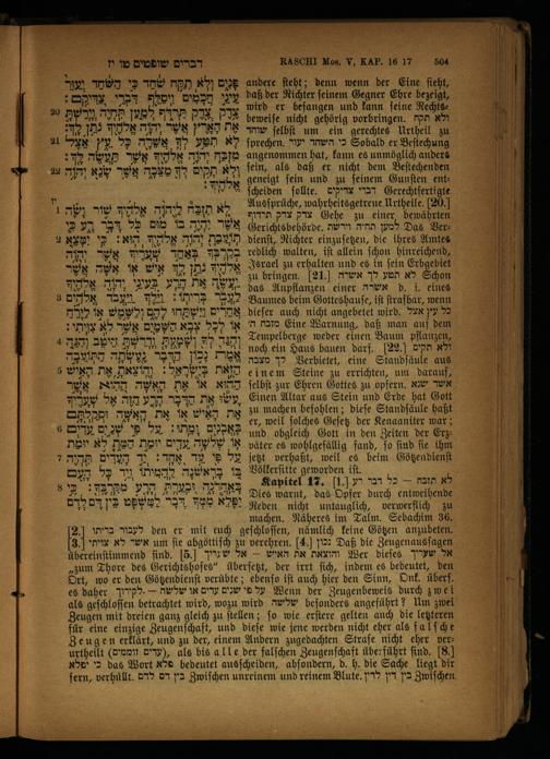 andere ſteht; denn wenn der Eine ſieht, daß der Richter ſeinem Gegner Ehre bezeigt, wird er befangen und kann ſeine Rechtsbeweiſe nicht gehörig vorbringen. ולא תקח שוהר ſelbſt um ein gerechtes Urtheil zu ſprechen. x. כי השחד Sobald er Beſtechung angenommen hat, kann es unmöglich anders ſein, als daß er nicht dem Beſtechenden geneigt ſein und zu ſeinem Gunſten entſcheiden ſollte. דברי צריקים Gerechtfertigte Ausſprüche, wahrheitsgetreue Urtheile. 20. צדק צדק תרדוף Gehe zu einer, bewährten Gerichtsbehörde. למען תחיה וירשת Das Verdienſt, Richter einzuſetzen, die ihres Amtes redlich walten, iſt allein ſchon hinreichend, Israel zu erhalten und es in ſein Erbgebiet zu bringen. 21] אשרה P לא תטע Schon das Anpflanzen einer אשרה d. i. eines Baumes beim Gotteshauſe, iſt ſtrafbar, wenn dieſer auch nicht angebetet wird. עין אצל* ה' nam Eine Warnung, daß man auf dem Tempelberge weder einen Baum pflanzen, noch ein Haus bauen darf. 22.) ולא תקים לך מצבה Verbietet, eine Standſäule aus einem Steine zu errichten, um darauf, ſelbſt zur Ehren Gottes zu opfern. אשד שנא Einen Altar aus Stein und Erde hat Gott zu machen befohlen; dieſe Standſäule haßt er, weil ſolches Geſetz der Kenaaniter war; und obgleich Gott in den Zeiten der Erz väter es wohlgefällig fand, ſo ſind ſie ihm jetzt verhaßt, weil es beim Götzendienſt Völkerſitte geworden iſt.. Kapitel 17.]1.[ לא תובח— כל דבר רע Dies warnt, das Opfer durch entweihende Reden nicht untauglich, verwerflich zu machen. Näheres im Talm. Sebachim 36.