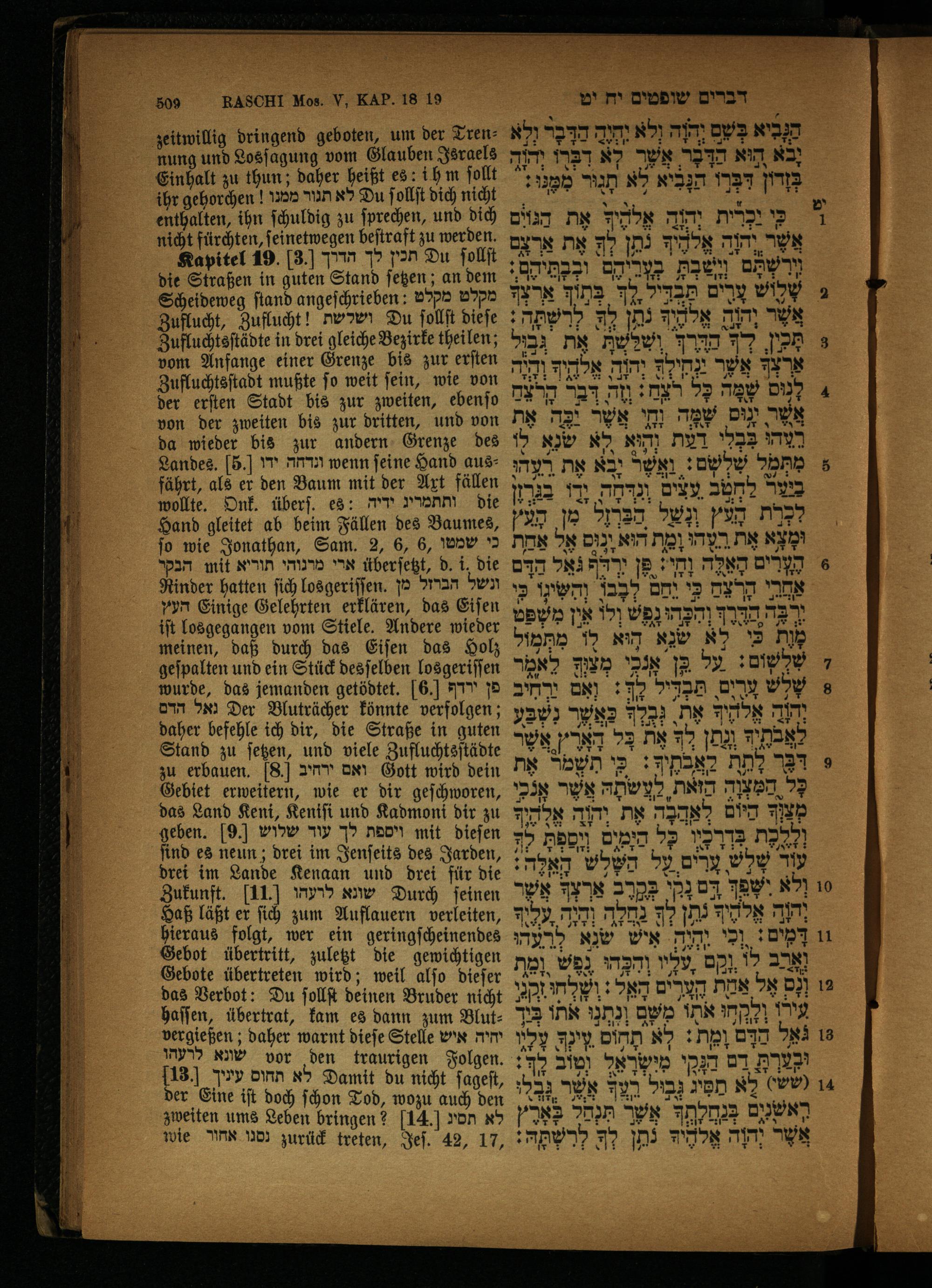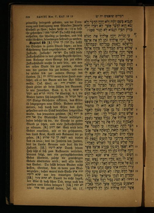 Kapitel 19. 3 תכין לך הדרך Du ſollſt die Straßen in guten Stand ſetzen; an dem Scheideweg ſtand angeſchrieben: מקלט מקלם Zuflucht, Zuflucht! ושלשת Du ſollſt dieſe ZJufluchtsſtädte in drei gleiche Bezirke theilen; vom Anfange einer Grenze bis zur erſten Zufluchtsſtadt mußte ſo weit ſein, wie von der erſten Stadt bis zur zweiten, ebenſo von der zweiten bis zur dritten, und von da wieder bis zur andern Grenze des Landes. 5. ונדחה ידו wenn feine Hand ausfährt, als er den Baum mit der Axt fällen wollte. Onk. Über]. 0%: ותתמריג ידיה Hand gleitet ab beim Fällen des Baumes, jo wie Jonathan, Sam. 2, 6, 6, כי שמטן wan mit ארי מרנוהי תוריא überſetzt, d. i, die Rinder hatten ſich losgeriſſen. ונשל הברזל מן העיץ Einige Gelehrten erklären, das Eiſen iſt losgegangen vom Stiele. Andere wieder meinen, daß durch das Eiſen das Holz geſpalten und ein Stück desſelben losgeriſſen wurde, das jemanden getödtet. 6. פן ירדף הדם 981 Der Bluträcher könnte verfolgen; daher befehle ich dir, die Straße in guten Stand zu ſetzen, und viele Zufluchtsſtädte zu erbauen. 8 ואם רחיב Gott wird dein Gebiet erweitern, wie er dir geſchworen, das Land Keni, Keniſi und Kadmoni dir zu geben. 9 ויספת לך עוד שלוש mit dieſen ſind es neun; drei im Jenſeits des Jarden, drei im Lande Kenaan und drei für die Zukunft. 11.) שוא לרעהו Durch ſeinen Haß läßt er ſich zum Auflauern verleiten, hieraus folgt, wer ein geringſcheinendes Gebot übertritt, zuletzt die gewichtigen Gebote übertreten wird; weil alſo dieſer das Verbot: Du ſollſt deinen Bruder nicht haſſen, übertrat, kam es dann zum Blutvergießen; daher warnt dieſe Stelle יחיה איש שונא לרעהו vor den traurigen Folgen. 13 עיניך enn לא Damit du nicht ſageſt, der Eine iſt doch ſchon Tod, wozu auch den