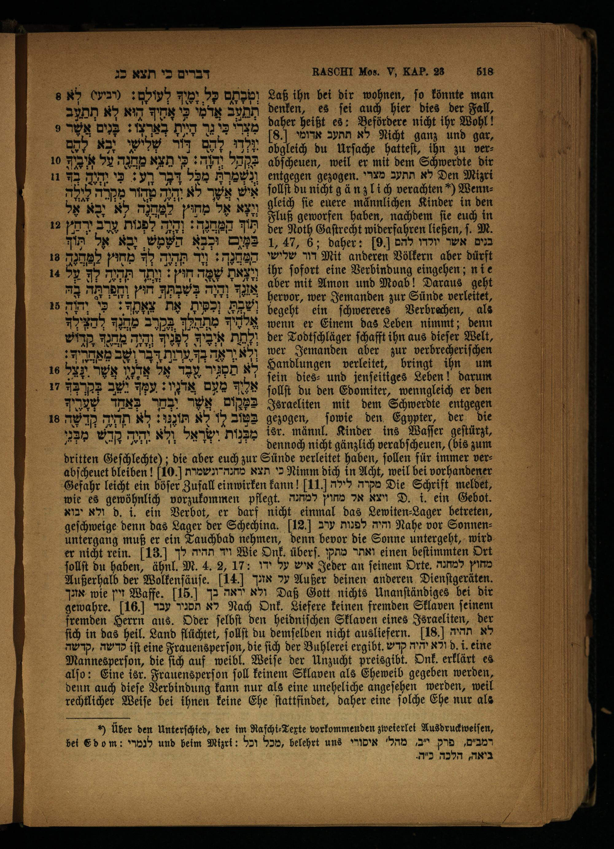 dritten Geſchlechte); die aber euch zur Sünde verleitet haben, ſollen für immer verabſcheuet bleiben! 10] תצא מהנהדונשמרת Nimm dich in Acht, weil bei vorhandener Gefahr leicht ein böſer Zufall einwirken kann! 11 מקרה לילה Die Schrift meldet, wie es gewöhnlich vorzukommen pflegt. nrw אל מחוץ rn D. i. ein Gebot. ולא יבוא d. i. ein Verbot, er darf nicht einmal das Lewiten⸗-Lager betreten, geſchweige denn das Lager der Schechina. 12 והיה לפנות ערב Nahe vor Sonnen: untergang muß er ein Tauchbad nehmen, denn bevor die Sonne untergeht, wird er nicht rein. 13 ויד תהיה לך Wie Onk. überſ. ואתר מתקו einen beſtimmten Ort ſollſt du haben, ähnl. M. 4. 2, 17: איש על ידו Jeder an feinem Orte. מחוץ למחנה Außerhalb der Wolkenſäuſe. 14 Pax על Außer deinen anderen Dienſtgeräten. PR wie n Waffe.]15.[ ולא יראה בך Daß Gott nichts Unanſtändiges bei dir gewahre. 16 לא תסגיר עבד Nach Onk. Liefere keinen fremden Sklaven ſeinem fremden Herrn aus. Oder ſelbſt den heidniſchen Sklaven eines Israeliten, der ſich in das heil. Land flüchtet, ſollſt du demſelben nicht ausliefern. 18] לא תהיה קדשה ,קרשה iſt eine Frauensperſon, die ſich der Buhlerei ergibt. ולא יהיה קדש eine Mannesperſon, die ſich auf weibl. Weiſe der Unzucht preisgibt. Onk. erklärt es alſo: Eine isr. Frauensperſon ſoll keinem Sklaven als Eheweib gegeben werden, denn auch dieſe Verbindung kann nur als eine uneheliche angeſehen werden, weil rechtlicher Weiſe bei ihnen keine Ehe ſtattfindet, daher eine ſolche Ehe nur als