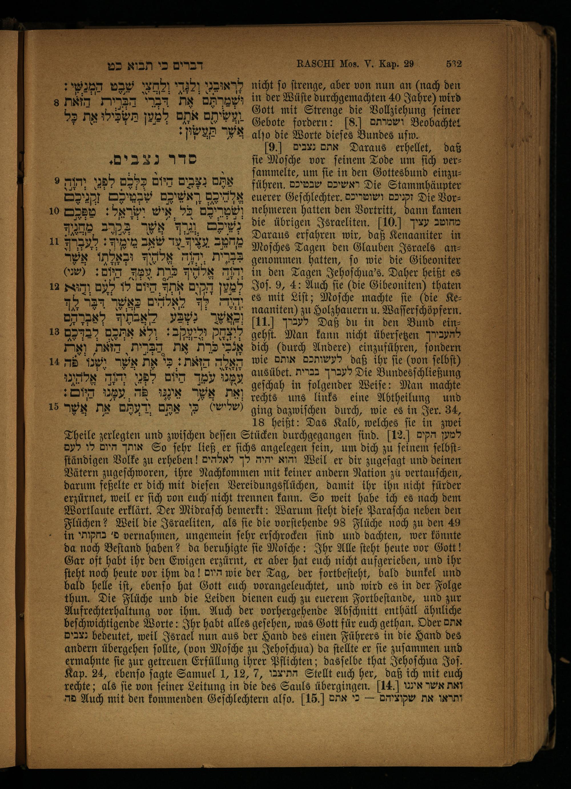 nicht ſo ſtrenge, aber von nun an(nach den in der Wüſte durchgemachten 40 Jahre) wird Gott mit Strenge die Vollziehung ſeiner Gebote fordern: 18. וששמרתם 4 alſo die Worte dieſes Bundes uſw. ]9.[ אתם נצבים Daraus erhellet, daß ſie Moſche vor ſeinem Tode um ſich verſammelte, um ſie in den Gottesbund einzuführen. ראשיכם שבטיכם Die Stammhäupter euerer Geſchlechter. זכניכם ושוטריכם Die Vornehmeren hatten den Vortritt, dann kamen die übrigen Israeliten. 10. מחוטב עציך Daraus erfahren wir, daß Kenaaniter in Moſches Tagen den Glauben Israels angenommen hatten, ſo wie die Gibeoniter in den Tagen Jehoſchua's. Daher heißt es Joſ. 9, 4: Auch ſie(die Gibeoniten) thaten es mit Liſt; Moſche machte fie(die Kenaaniten) zu Holzhauern u. Waſſerſchöpfern. 11] לעברך Daß du in den Bund ein gehſt. Man kann nicht überſetzen Poaynd dich(durch Andere) einzuführen, ſondern wie לעשותכם אותם daß ihr fie(von ſelbſt) ausübet. לעברך בברית Die Bundesſchließung geſchah in folgender Weiſe: Man machte rechts uns links eine Abtheilung und ging dazwiſchen durch, wie es in Jer. 34,
