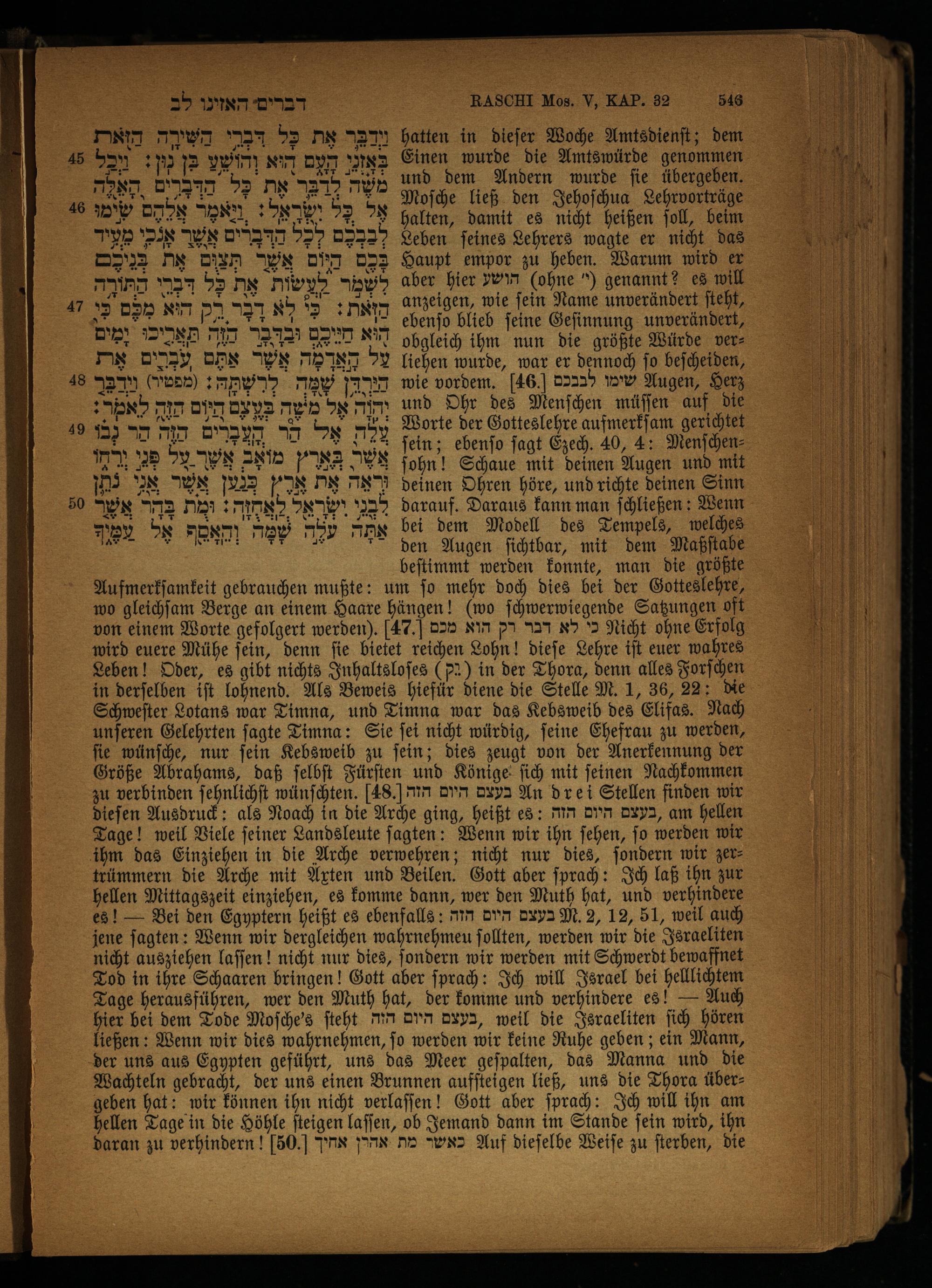 Aufmerkſamkeit gebrauchen mußte: um ſo mehr doch dies bei der Gotteslehre, wo gleichſam Berge an einem Haare hängen!(wo ſchwerwiegende Satzungen oft von einem Worte gefolgert werden). 47. כי לא דבר רק הוא מכם Nicht ohne Erfolg wird euere Mühe fein, denn ſie bietet reichen Lohn! dieſe Lehre iſt euer wahres Leben! Oder, es gibt nichts Inhaltsloſes(a) in der Thora, denn alles Forſchen in derſelben iſt lohnend. Als Beweis hiefür diene die Stelle M. 1, 36, 22: die Schweſter Lotans war Timna, und Timna war das Kebsweib des Elifas. Nach unſeren Gelehrten ſagte Timna: Sie ſei nicht würdig, feine Ehefrau zu werden, ſie wünſche, nur ſein Kebsweib zu ſein; dies zeugt von der Anerkennung der Größe Abrahams, daß ſelbſt Fürſten und Könige ſich mit ſeinen Nachkommen zu verbinden ſehnlichſt wünſchten. 48. הזה dyn בעצם An drei Stellen finden wir dieſen Ausdruck: als Noach in die Arche ging, heißt es: הזה dyn ,בעצם am hellen Tage! weil Viele ſeiner Landsleute ſagten: Wenn wir ihn ſehen, ſo werden wir ihm das Einziehen in die Arche verwehren; nicht nur dies, ſondern wir zertrümmern die Arche mit Arten und Beilen. Gott aber ſprach: Ich laß ihn zur hellen Mittagszeit einziehen, es komme dann, wer den Muth hat, und verhindere es!— Bei den Egyptern heißt es ebenfalls: בעצם היום הזה M. 2, 12, 51, weil auch jene ſagten: Wenn wir dergleichen wahrnehmeu ſollten, werden wir die Israeliten nicht ausziehen laſſen! nicht nur dies, ſondern wir werden mit Schwerdt bewaffnet Tod in ihre Schaaren bringen! Gott aber ſprach: Ich will Israel bei helllichtem Tage herausführen, wer den Muth hat, der komme und verhindere es!— Aug hier bei dem Tode Moſche's ſteht mm dyn ,בעצם weil die Israeliten ſich hören ließen: Wenn wir dies wahrnehmen, ſo werden wir keine Ruhe geben; ein Mann, der uns aus Egypten geführt, uns das Meer geſpalten, das Manna und die Wachteln gebracht, der uns einen Brunnen aufſteigen ließ, uns die Thora übergeben hat: wir können ihn nicht verlaſſen! Gott aber ſprach: Ich will ihn am hellen Tage in die Höhle ſteigen laſſen, ob Jemand dann im Stande ſein wird, ihn daran zu verhindern! 50] כאשר מת אהרן אחיך Auf dieſelbe Weiſe zu ſterben, die