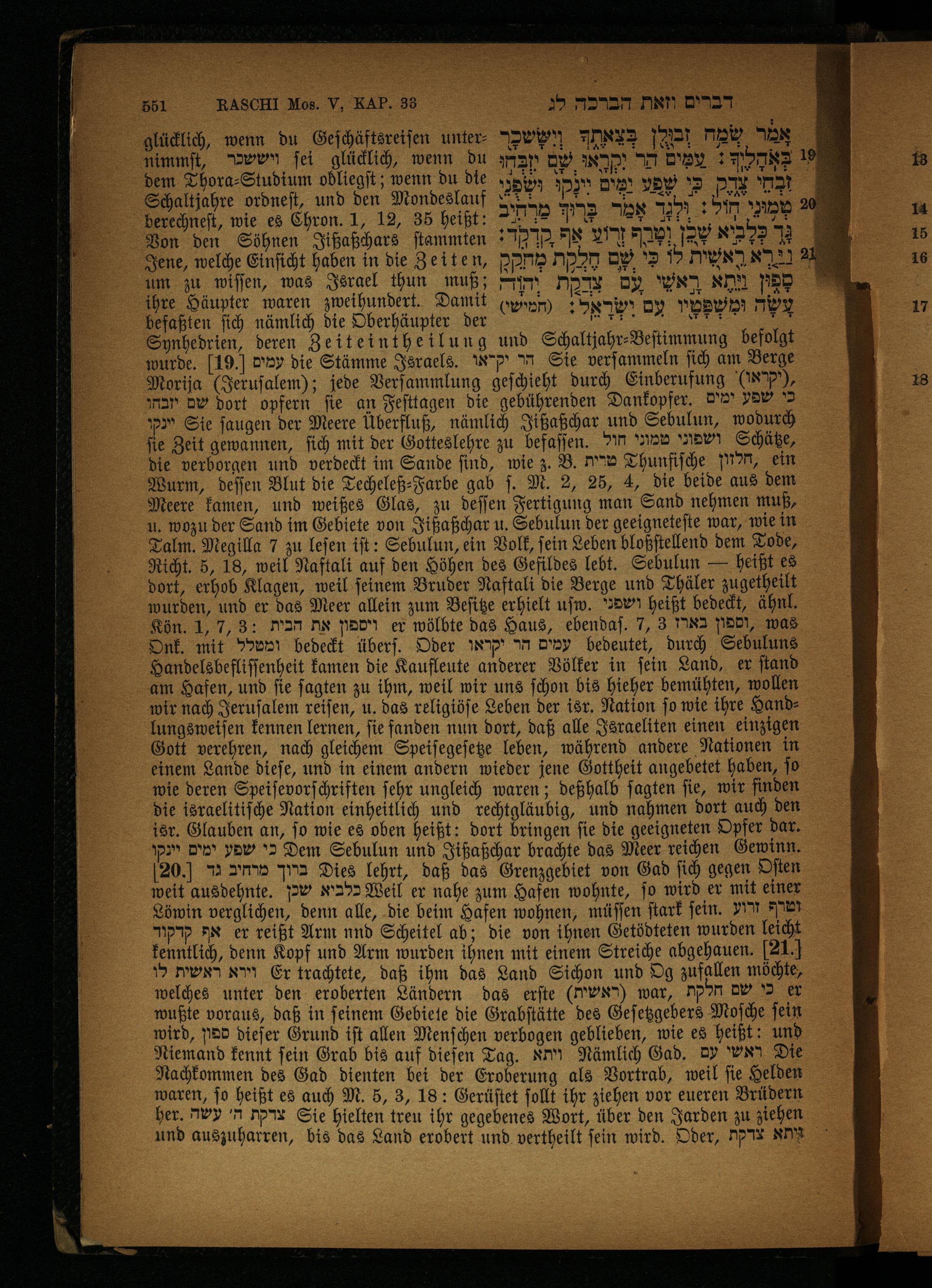 dem Thora-Studium obliegſt; wenn du die ושפנ wlan זכחי צדק. כו שפע ומים Schaltjahre ordneſt, und den Mondeslauf ALL ב הש אה= שה, herechneſl, wie es Chron. 1, 13, 35 heißt: 1 R חיל: 37 אָמר n, Von den Söhnen Jißaßchars ſtammten: 7 ְּלְבִיא 12, ודוע אף 72 Jene, welche Einſicht haben in die Zeiten, מחקק nr) לו כִּי שם rx)* 4 3 wiſſen, was ö thun muß; ראשי עם צדקת הוה sn, סְפּן ihre Häupter waren zweihundert. Damit ישראפ+(חמישי) Mu שפמיו> unteren befaßten ſich nämlich die Oberhäupter der ren,, ,,,, TEN Synhedrien, deren Zeiteintheilung und Schaltjahr-Beſtimmung befolgt wurde. 19. עמים die Stämme Israels. Rep) הר 60 verſammeln ſich am Berge Morija(Jeruſalem); jede Verſammlung geſchieht durch Einberufung ,(יקראו) mar שם dort opfern fie an Feſttagen die gebührenden Dankopfer, n' por, Pr Sie ſaugen der Meere Überfluß, nämlich Jißaßchar und Sebulun, wodurch fie Zeit gewannen, ſich mit der Gotteslehre zu befaſſen. 211 200 ושפוני Schätze, die verborgen und verdeckt im Sande find, wie z. B. än Thunfiſche ,חלזון ein Wurm, deſſen Blut die Techeleß⸗-Farbe gab ſ. M. 2, 25, 4, die beide aus dem Meere kamen, und weißes Glas, zu deſſen Fertigung man Sand nehmen muß, u. wozu der Sand im Gebiete von Jißaßchar u. Sebulun der geeigneteſte war, wie in Talm. Megilla 7 zu leſen iſt: Sebulun, ein Volk, ſein Leben bloßſtellend dem Tode, Richt. 5, 18, weil Naftali auf den Höhen des Gefildes lebt. Sebulun— heißt es dort, erhob Klagen, weil ſeinem Bruder Naftali die Berge und Thäler zugetheilt wurden, und er das Meer allein zum Beſitze erhielt uſw. רשפני heißt bedeckt, ähnl. Kön. 1, 7, 3: ויספון את הבית er wölbte das Haus, ebendaſ. 7, 3 בארז NED, was Onk. mit ומטלל bedeckt überſ. Oder עמים הר יקראו bedeutet, durch Sebuluns Handelsbefliſſenheit kamen die Kaufleute anderer Völker in fein Land, er ſtand am Hafen, und ſie ſagten zu ihm, weil wir uns ſchon bis hieher bemühten, wollen wir nach Jeruſalem reiſen, u. das religiöſe Leben der isr. Nation ſo wie ihre Handlungsweiſen kennen lernen, fie fanden nun dort, daß alle Israeliten einen einzigen 9011 verehren, nach gleichem Speiſegeſetze leben, während andere Nationen in einem Lande dieſe, und in einem andern wieder jene Gottheit angebetet haben, ſo wie deren Speiſevorſchriften ſehr ungleich waren; deßhalb ſagten ſie, wir finden die israelitiſche Nation einheitlich und rechtgläubig, und nahmen dort auch den isr. Glauben an, ſo wie es oben heißt: dort bringen ſie die geeigneten Opfer dar. כי שפע ימים יינקו Dem Sebulun und Jißaßchar brachte das Meer reichen Gewinn. 20)* ברוך מרחיב Dies lehrt, daß das Grenzgebiet von Gad ſich gegen Oſten weit ausdehnte. כלביא שכן Weil er nahe zum Hafen wohnte, ſo wird er mit einer Löwin verglichen, denn alle, die beim Hafen wohnen, müſſen ſtark ſein. MM וטרף אף קרקוד er reißt Arm nnd Scheitel ab; die von ihnen Getödteten wurden leicht kenntlich, denn Kopf und Arm wurden ihnen mit einem Streiche abgehauen. 21. וירא ראשית לו Er trachtete, daß ihm das Land Sichon und Og zufallen möchte, welches unter den eroberten Ländern das erſte(ראשית) war, כי שם חלקת er wußte voraus, daß in feinem Gebiete die Grabſtätte des Geſetzgebers Moſche fein wird, ספון dieſer Grund iſt allen Menſchen verbogen geblieben, wie es heißt: und Niemand kennt ſein Grab bis auf dieſen Tag. ותא Nämlich Gad. Dy ראשי 6 Nachkommen des Gad dienten bei der Eroberung als Vortrab, weil ſie Helden waren, ſo heißt es auch M. 5, 3, 18: Gerüſtet ſollt ihr ziehen vor eueren Brüdern her. צרקת 5 עשה Sie hielten treu ihr gegebenes Wort, über den Jarden zu ziehen und auszuharren, bis das Land erobert und vertheilt fein wird. Oder, M* יתא