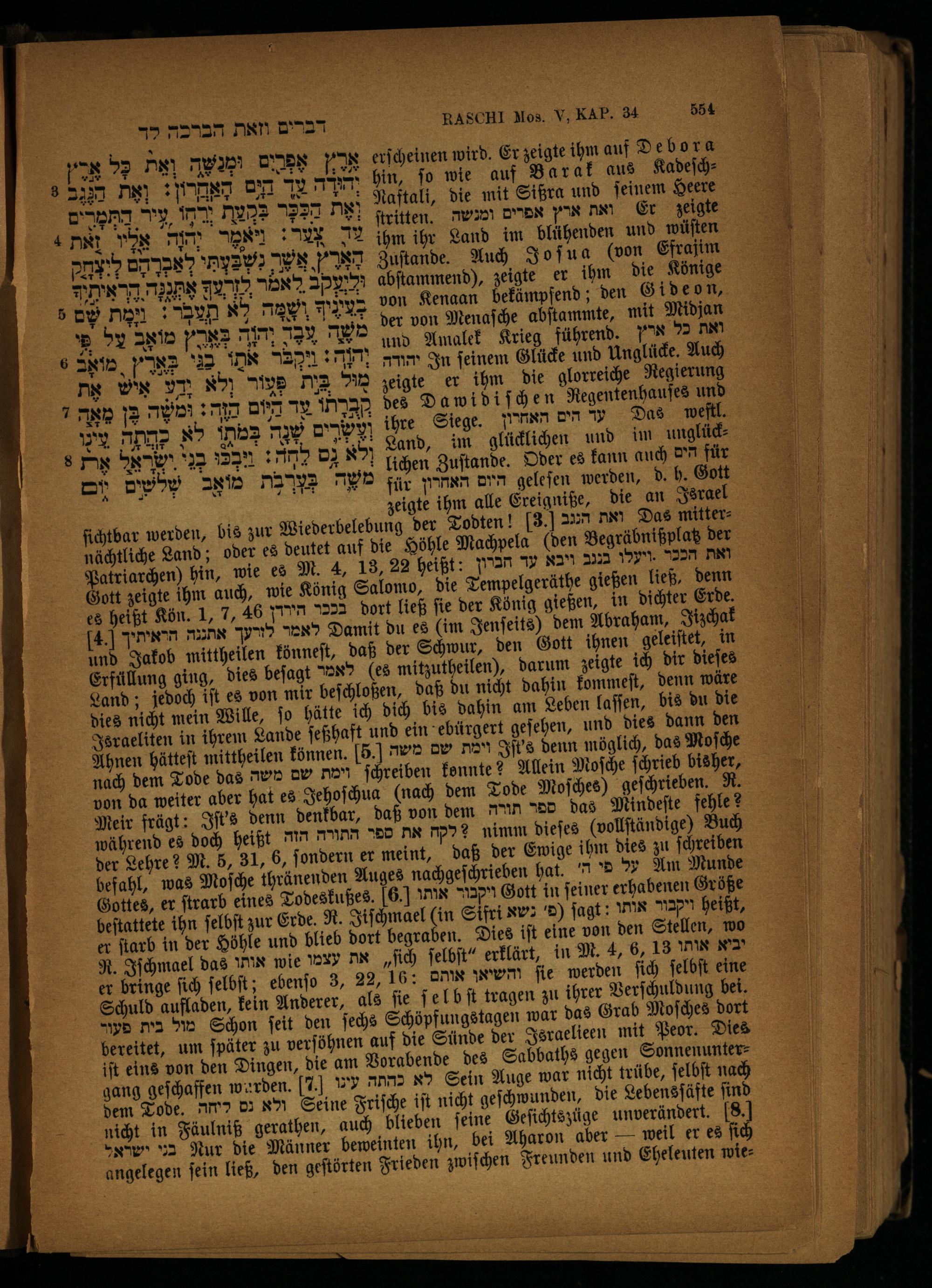 5 בעינוף ושמה לא תעבר: ומת שם... den ö n, Om m J, DET von Nenaſche abſtammte, mit Midjan 4 5 ב צל N ה 5 הוה und Amalek Krieg führend.* כל nei אתו בג באר מואָב ל ER יהודה In feinem Gkücke und Unglücke. Auch אֶת OWN DT ולא BB 3 מוּל zeigte er ihm die glorreiche Regierung 7 עד היום הַזֶה: וּמשָה 132 מאֶה iM 9 Dawidiſchen Regentenhaufes und וטשרים שנָה בְּמתו לא כהתה עִינו ö Siege.. הים 4 Das bet 8 Y ולא- לחה: ויבכו 2 ישראל and, im glück hen und im unglü. k Zuſtande. Oder es kann auch הים für DV מ שה בְּצְרְבֶת מואָב שֶלשים für היום האחרון gelefen werden, d. h. Gott zeigte ihm alle Ereigniße, die an Israel ſichtbar werden, bis zur Wiederbelebung der Todten! 3.]* ואת Das mitternächtliche Land; oder es deutet auf die Höhle Machpela(den Begräbnißplatz der Patriarchen) hin, wie es M. 4, 183, 23 heißt: ואת הככר.ויעלו בגנב ויבא עד חברון Gott zeigte ihm auch, wie König Salomo, die Tempelgeräthe gießen ließ denn es heißt Kön. 1, 7, 46 הירדן 1222 dort ließ ſie der König gießen, in dichter Erde. 4. הראיתיך nin לאמר לורעך Damit du es(im Jenſeits) dem Abraham, Iizchak und Jakob mittheilen könneſt, daß der Schwur, den Gott ihnen geleiſtet, in Erfüllung ging, dies beſagt לאמר(es mitzutheilen), darum zeigte ich dir dieſes Land; jedoch iſt es von mir beſchloßen, daß du nicht dahin kommeſt, denn wäre dies nicht mein Wille, ſo hätte ich dich bis dahin am Leben laſſen, bis du die Israeliten in ihrem Lande ſeßhaft und ein ebürgert geſehen, und dies dann den Ahnen hätteſt mittheilen können. 6. וימת שם משה Iſt benn möglich, das Moſche nach dem Tode das משה DW וימת ſchreiben konnte? Allein Moſche ſchrieb bisher, von da weiter aber hat es Jehoſchua(nach dem Tode Moſches) geſchrieben. R. Meir frägt: Iſt's denn denkbar, daß von dem ספר תורה das Mindeſte fehle? während es doch heißt na לקה את ספר התורה? nimm 868(vollſtändige) Buch der Lehre? M. 5, 31, 6, ſondern er meint, daß der Ewige ihm dies zu ſchreiben befahl, was Moſche thränenden Auges nachgeſchrieben hat.* על Am Munde Gottes, er ſtrarb eines Todeskußes.[6.] ויקבור אותו Gott in feiner erhabenen Größe beſtattete ihn ſelbſt zur Erde. R. Jiſchmael(in Sifri נשא S) ſagt: אותו M5) heißt, er ſtarb in der Höhle und blieb dort begraben. Dies iſt eine von den Stellen, wo R. Iſchmael das אותו wie את עצמו„ich ſelbſt“ erklärt, in M. 4, 6, 13 יביא אותו er bringe ſich ſelbſt; ebenſo 3, 22, 16: והשיאן אוהם ſie werden ſich ſelbſt eine Schuld aufladen, kein Anderer, als fie ſelbſt tragen zu ihrer Verſchuldung bei. ye מול בית Schon ſeit den ſechs Schöpfungstagen war das Grab Moſches dort bereitet, um ſpäter zu verſöhnen auf die Sünde der Jsraelieen mit Peor. Dies iſt eins von den Dingen, die am Vorabende des Sabbaths gegen Sonnenuntergang geſchaffen warden. 7] לא כהתה עינו Sein Auge war nicht trübe, ſelbſt nach dem Tode. ליחה de ולא Seine Friſche iſt nicht geſchwunden, die Lebensſäfte ſind nicht in Fäulniß gerathen, auch blieben ſeine Geſichtszüge unverändert. 8. בני ישראל Nur die Männer beweinten ihn, bei Aharon aber— weil er es fi angelegen ſein ließ, den geſtörten Frieden zwiſchen Freunden und Eheleuten wie
