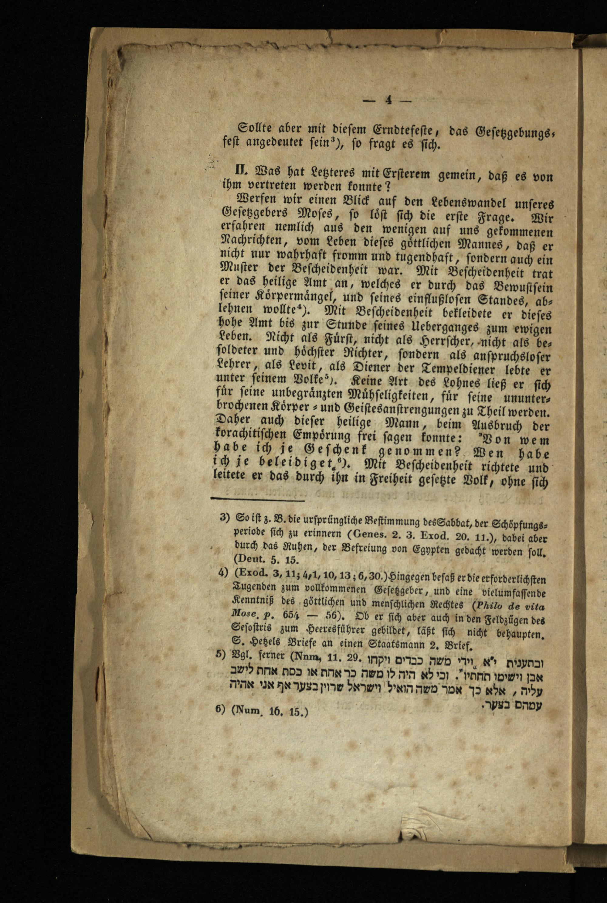 Werfen wir einen Blick auf den Lebenswandel unseres Gesetzgebers Moses , so lost sich die erste Frage. Wir erfahren nemlich aus den wenigen auf uns gekommenen Nachrichten, vom Leben dieses göttlichen Mannes, daß er nicht nur wahrhaft fromm und tugendhaft, sondern auch ein Muster der Bescheidenheit war. Mit Bescheidenheit trat er das heilige Amt an, welches er durch das Bewußtsein seiner Körpermångel, und seines einflußlosen Standes, ablehnen wollte). Mit Bescheidenheit bekleidete er dieses hohe Amt bis zur Stunde seines Ueberganges zum ewigen Leben. Nicht als Fürst, nicht als Herrscher, nicht als bes soldeter und höchster Richter, sondern als anspruchsloser Lehrer, als Levit, als Diener der Tempeldiener lebte er unter seinem Volkes). Keine Art des Lohnes ließ er sich für seine unbegränzten Mühseligkeiten, für seine ununterbrochenen Körper und Geistesanstrengungen zu Theil werden. Daher auch dieser heilige Mann, beim Ausbruch der forachitischen Empórung frei sagen fonnte:" Von wem habe ich je Geschenk genommen? Wen habe ich je beleidiget). Mit Bescheidenheit richtete und leitete er das durch ihn in Freiheit gesetzte Volf, ohne sich