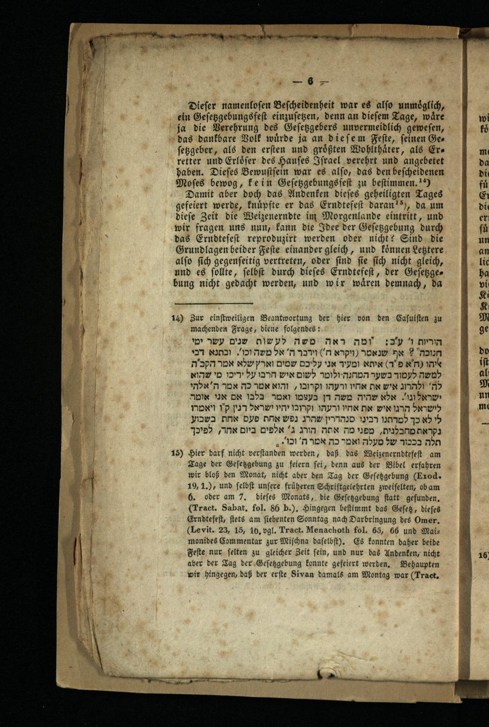 Damit aber doch das Andenken dieses geheiligten Lages gefeiert werde, knüpfte er das Erndtefest daran¹³), da um diese Zeit die Weizenerndte im Morgenlande eintritt, und wir fragen uns nun, kann die Idee der Gesetzgebung durch das Erndtefest reproduzirt werden oder nicht? Sind die Grundlagen beider Feste einander gleich, und können Letztere also sich gegenseitig vertreten, oder sind sie sich nicht gleich, und es sollte, selbst durch dieses Erndtefest, der Gesetzge bung nicht gedacht werden, und wir wären demnach, da
