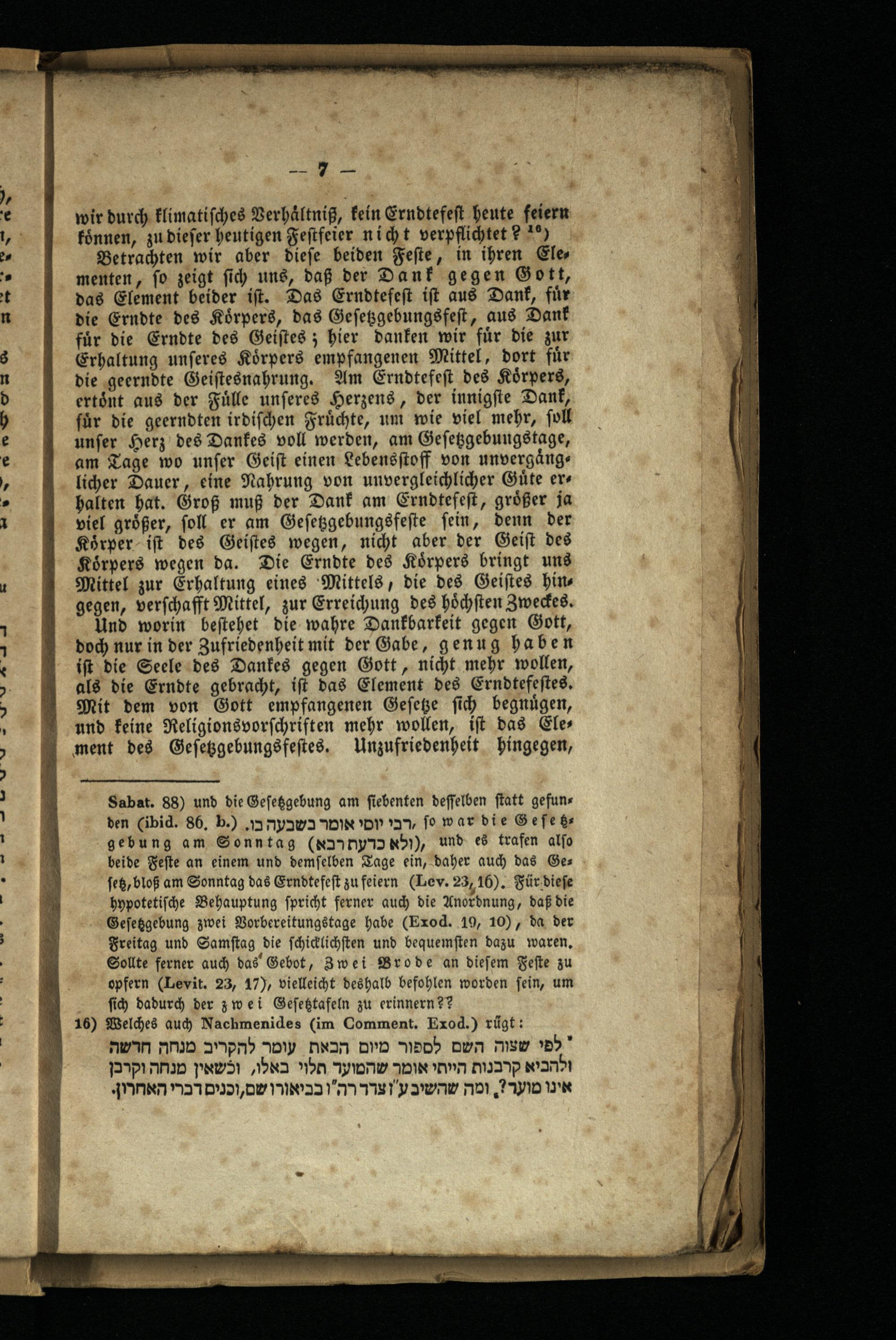 Sabat . 88) und die Gesetzgebung am siebenten desselben statt gefun den( ibid. 86, b.).17 IN' DI 7, so war die Gesezs gebung am Sonntag( Nanny N51), und es trafen also beide Feste an einem und demselben Tage ein, daher auch das Ges ses, bloß am Sonntag das Erndtefest zu feiern( Lev. 23, 16). Für diese hypotetische Behauptung spricht ferner auch die Anordnung, daß die Gesetzgebung zwei Vorbereitungstage habe( Exod. 19, 10), da der Freitag und Samstag die schicklichsten und bequemsten dazu waren. Sollte ferner auch das Gebot, 3 wei Brode an diesem Feste zu opfern( Levit. 23, 17), vielleicht deshalb befohlen worden sein, um sich dadurch der zwei Geseztafeln zu erinnern?? 16) Welches auch Nachmenides( im Comment. Exod.) rügt: