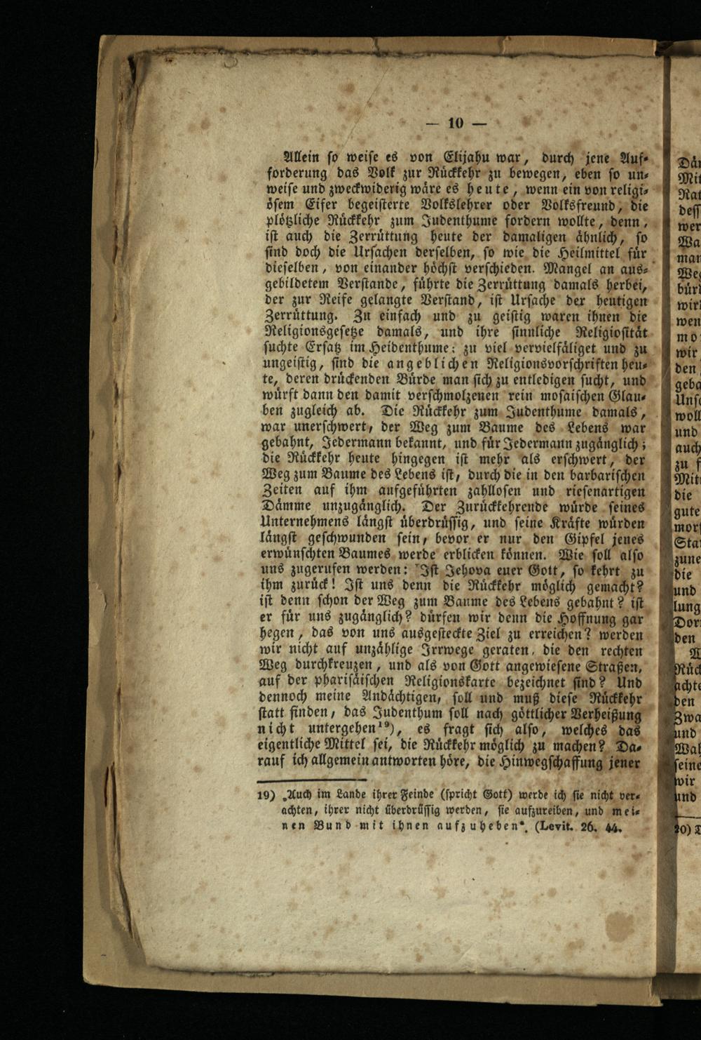 Allein fo weiſe es von Elijahu war, durch jene Aufforderung das Volk zur Ruͤckkehr zu bewegen, eben fo uns weiſe und zweckwiderig waͤre es heute, wenn ein von religioͤſem Eifer begeiſterte Volkslehrer oder Volksfreund, die ploͤtzliche Ruͤckkehr zum Judenthume fordern wollte, denn, iſt auch die Zerruͤttung heute der damaligen aͤhnlich, ſo ſind doch die Urſachen derſelben, ſo wie die Heilmittel fuͤr dieſelben, von einander hoͤchſt verſchieden. Mangel an ausgebildetem Verſtande, fuͤhrte die Zerruͤttung damals herbei, der zur Reife gelangte Verſtand, iſt Urſache der heutigen Zerruͤttung. Zu einfach und zu geiſtig waren ihnen die Religionsgeſetze damals, und ihre ſinnliche Religioſitaͤt ſuchte Erſatz im Heidenthume; zu viel vervielfaͤliget und zu ungeiſtig, find die angeblichen Religionsvorſchriften heute, deren druckenden Burde man ſich zu entledigen ſucht, und wuͤrft dann den damit verſchmolzenen rein moſaiſchen Glau—ben zugleich ab. Die Ruͤckkehr zum Judenthume damals, war unerſchwert, der Weg zum Baume des Lebens war gebahnt, Jedermann bekannt, und fuͤr Jedermann zugänglich; die Ruͤckkehr heute hingegen iſt mehr als erſchwert, der Weg zum Baume des Lebens iſt, durch die in den barbariſchen Zeiten auf ihm aufgeführten zahlloſen und rieſenartigen Daͤmme unzugaͤnglich. Der Zuruͤckkehrende wuͤrde ſeines Unternehmens laͤngſt uͤberdruͤſſig, und ſeine Kräfte würden laͤngſt geſchwunden ſein, bevor er nur den Gipfel jenes erwuͤnſchten Baumes werde erblicken koͤnnen. Wie, fol alſo uns zugerufen werden: Iſt Jehova euer Gott, ſo kehrt zu ihm zuruck! Iſt uns denn die Ruͤcklehr möglich gemacht? iſt denn ſchon der Weg zum Baume des Lebens gebahnt? iſt er fuͤr uns zugaͤnglich? duͤrfen wir denn die Hoffnung gar hegen, das von uns ausgeſteckte Ziel zu erreichen? werden wir nicht auf unzaͤhlige Irrwege geraten, die den rechten Weg durchkreuzen, und als von Gott angewieſene Straßen, auf der phariſaͤiſchen Religionskarte bezeichnet ſind? Und dennoch meine Andaͤchtigen, ſoll und muß dieſe Rückkehr ſtatt finden, das Judenthum ſoll nach göttlicher Verheißung nicht untergehen“), es fragt ſich alſo, welches das eigentliche Mittel ſei, die Ruͤckkehr möglich zu machen? Das rauf ich allgemein antworten höre, die Hinwegſchaffung jener 19) Auch im Lande ihrer Feinde(ſpricht Gott ) werde ich fie nicht vere