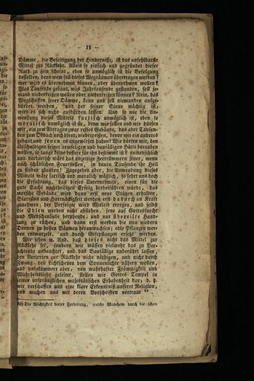 moraliſch unmoͤglich iſt ſie, denn wie ſollen und wie dürfen wir, ein zum Abtragen zwar reifes Gebaͤude, das aber Tauſenden zum Obdach noch dient, niederreißen, bevor wir ein anderes gl.ebaut und jenen es angewieſen haben? Wie dürfen wir, den Unſchuldigen feiner armſeligen und baufaͤlligen Hütte berauben vollen, ſo lange keine beſſere für ihn beſtimmt iſt? unmenſchlich und barbariſch waͤrs das unzeitige Zertruͤmmern jener, wenn auch ſchaͤdlichen Feuerſtellen, in denen Tauſende ihr Heil zu finden glauben! Zugegeben aber, die Anwendung dieſes Mittels wäre factiſch und moralich möglich, fo lehrt uns doch die Erfahrung, daß dieſes Unternehmen, einen fuͤr die gute Sache nachtheiligen Erfolg herbeifuuͤhren würde, das morſche Gebäude: wird dann erſt neue Stuͤtzen erhalten, Starrſinn und Hartnaͤckigkeit werden erſt dadurch an Kraft zunehmen; der Verfolgte wird Mitleid erregen, und ſelbſt die Edlen werden nicht abſtehen, jene auf Gottesfurcht und Menſchenliebe beruhende, und nur uͤbereilte Hands lung zu rächen, und dann erſt werden die nun niedern ¶Dornen zu hohen Baͤumen heranwachſen; edle Pflanzen werden entwurzelt, und durch Giftpflanzen erfetzt werden. Wir ſehen m. And. daß dieſes nicht das Mittel zur Ruͤckkehr fer, ſondern wir muͤſſen vielmehr das zu Vers achtende unbeachtet, und das Bau faͤllige unberührt laſſen, den Verirrten zur Rückkehr nicht noͤthigen, und nicht durch Zwang, den Lichtſcheuen dem Sonnenlichte naͤhern wollen, und unbekuͤmmert aber, von wahrhafter Froͤmmigkeit und Wahrheitsliebe geleitet, ſtellen wir Gottes Tempel in seiner urſpruͤnglichen majestaͤtiſchen Erhabenheit dar, d. h. wir verſchaffen uns eine klare Erkenntniß unſerer Religion, und machen uns mit deren Vorſchriften vertraut 36.