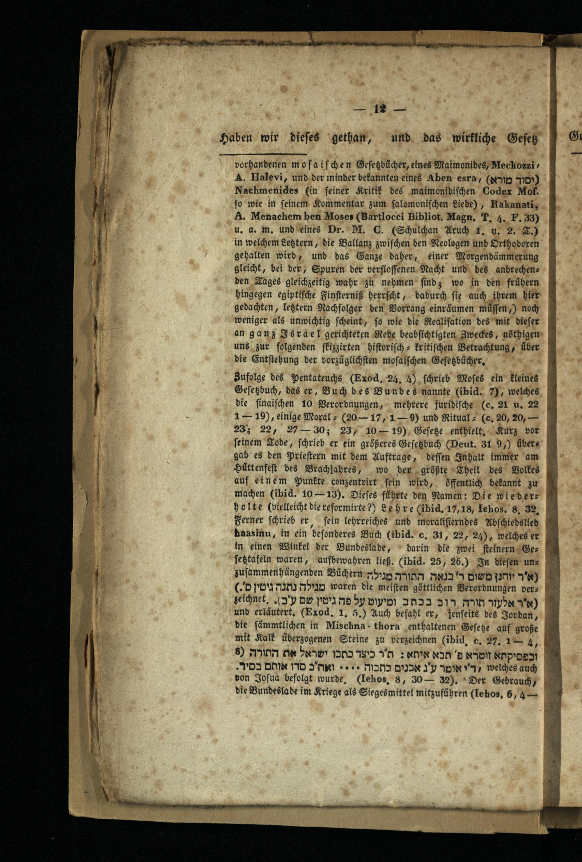 vorhandenen mosaischen Gefeßbücher, eines Maimonides, Meckozzi, A. Halevi, und der minder bekannten eines Aben esra,( NID 710) Nachmenides( in seiner Kritik des maimonidischen Codex Mof. so wie in seinem Kommentar zum salomonischen Liede), Rakanati, A. Menachem ben Moses( Bartlocci Bibliot, Magn. T. 4. F. 33) u. a. m. und eines Dr. M. C.( Schulchan Aruch 1. u. 2. T.) in welchem Lettern, die Ballanz zwischen den Neologen und Orthodoxen gehalten wird, und das Ganze daher, einer Morgendämmerung gleicht, bei der, Spuren der verfloffenen Nacht und des anbrechens den Tages gleichzeitig wahr zu nehmen sind; wo in den frühern hingegen egiptische Finsterniß herrscht, dadurch sie auch ihrem hier gedachten, legtern Nachfolger den Vorrang einräumen müssen,) noch weniger als unwichtig scheint, so wie die Realisation des mit dieser an ganz sra el gerichteten Rede beabsichtigten 3weckes, nöthigen uns zur folgenden skizzirten historisch kritischen Betrachtung, über die Entstehung der vorzüglichsten mosaischen Gesezbücher. Bufolge des Pentateuche( Exod, 24. 4) schrieb Moses ein kleines Gesetzbuch, das er, Buch des Bundes nannte( ibid. 7), welches die sinaischen 10 Verordnungen, mehrere juridische( c. 21 u. 22 1-19), einige Moral( 20-17, 1-9) und Ritual( c. 20, 20,- 23; 22, 27-30; 23, 10-19) Gesege enthielt. Kurz vor seinem Tode, schrieb er ein größeres Gefeßbuch( Deut. 31 9,) über gab es den Priestern mit dem Auftrage, dessen Inhalt immer am Hüttenfest des Brachjahres, wo der größte Theil des Volkes auf einem Punkte conzentrirt sein wird, öffentlich bekannt zu machen( ibid. 10-13). Dieses führte den Namen: Die wieder= holte( vielleicht die reformirte?) Lehre( ibid, 17, 18, Iehos. 8. 32. Ferner schrieb er sein lehrreiches und moralisierndes Abschiedslieb baasinu, in ein besonderes Buch( ibid. c. 31, 22, 24), welches er in einen Winkel der Bundeslade, darin die zwei steinern Ges fegtafeln waren, aufbewahren ließ.( ibid. 25, 26.) In diesen un